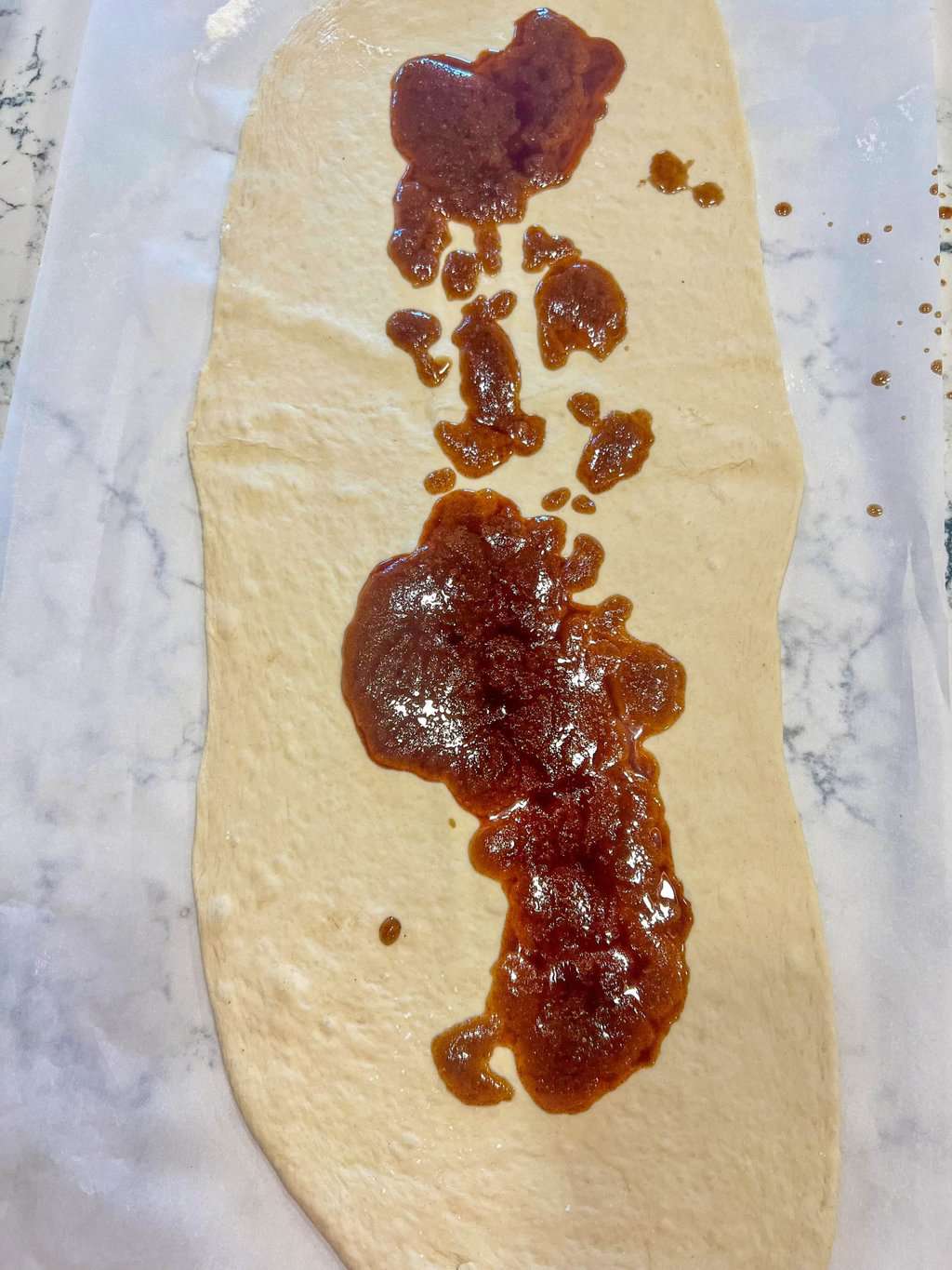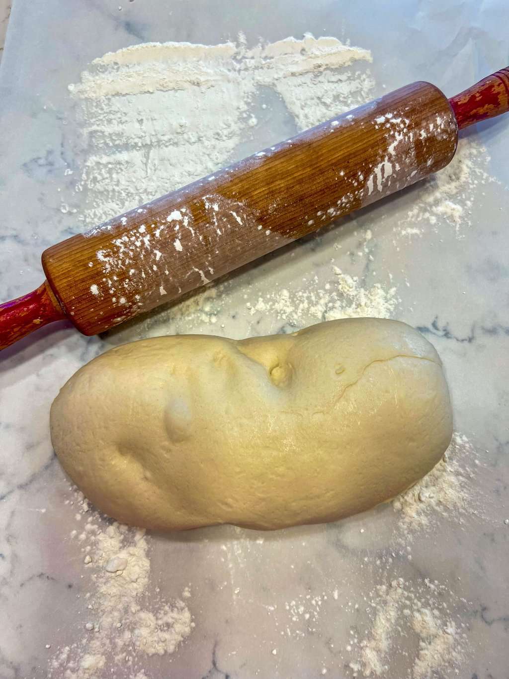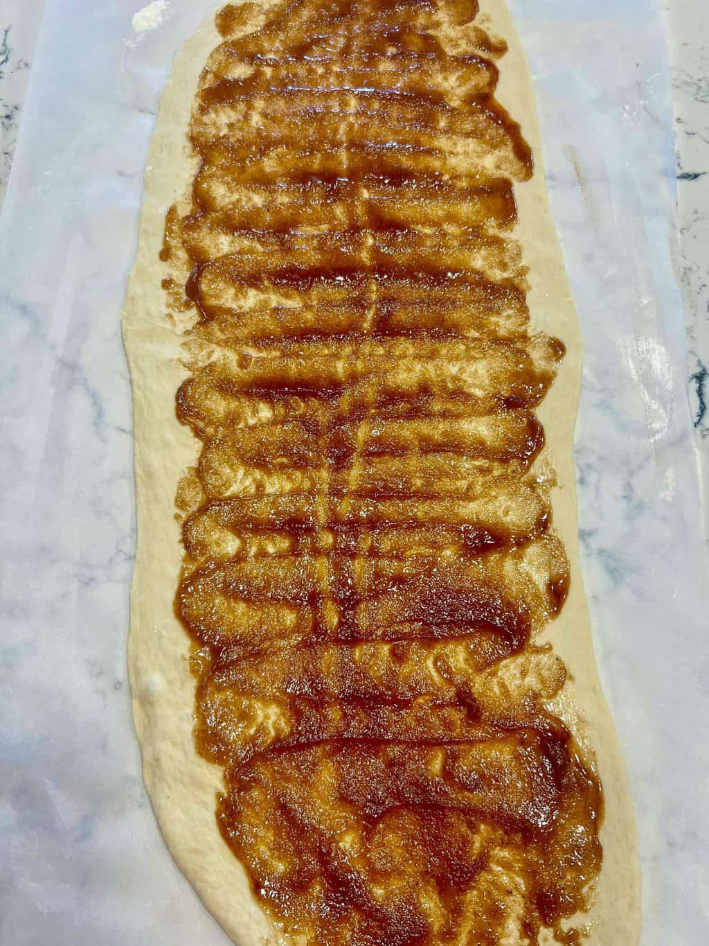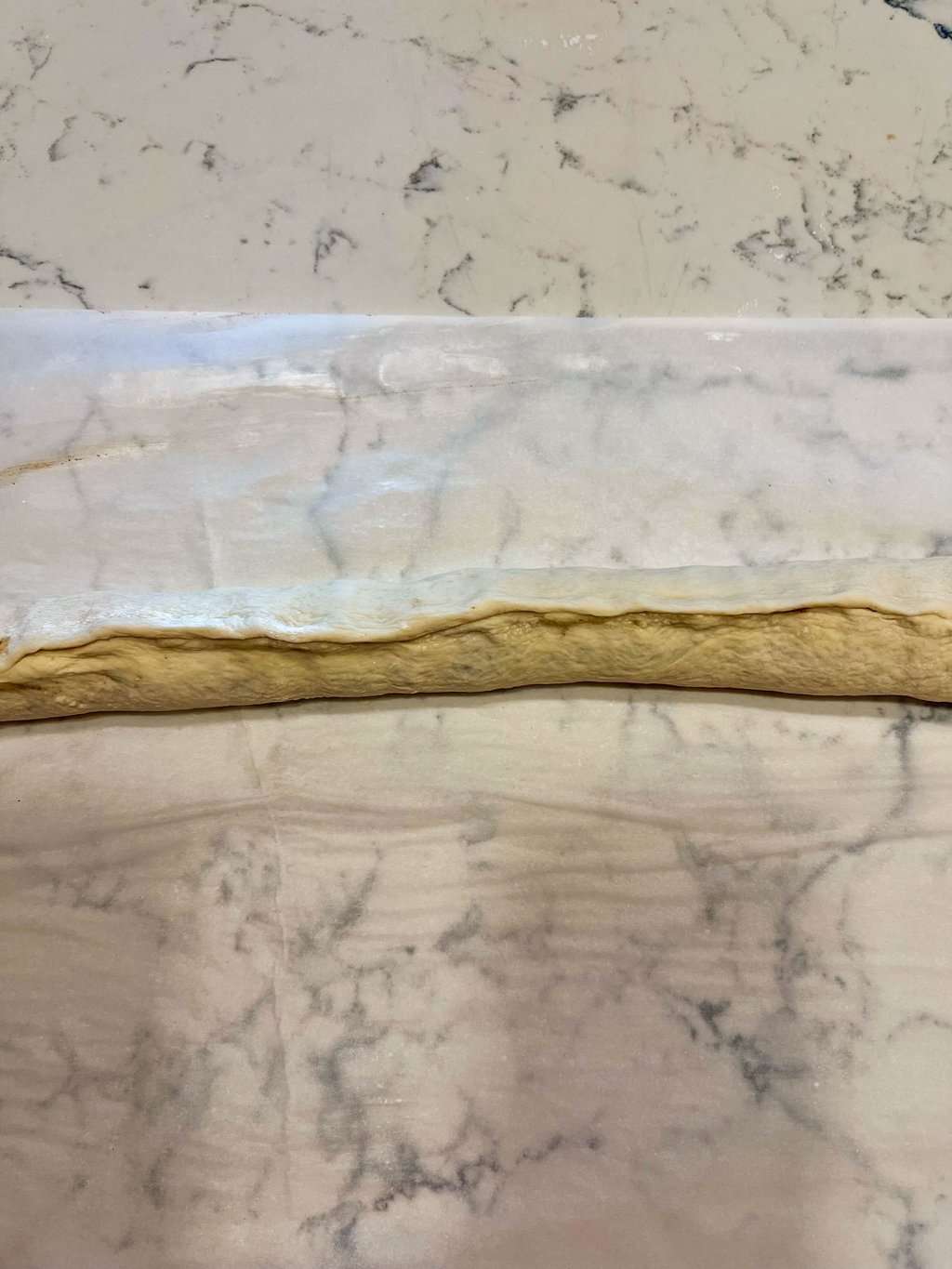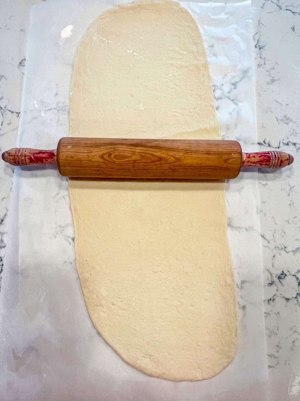 - Roll out dough to a rectangle about 10×24. My rolling pin is 10 inches long and I use it as a guide.
