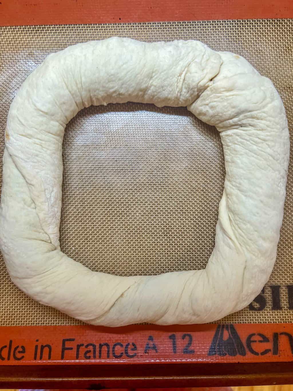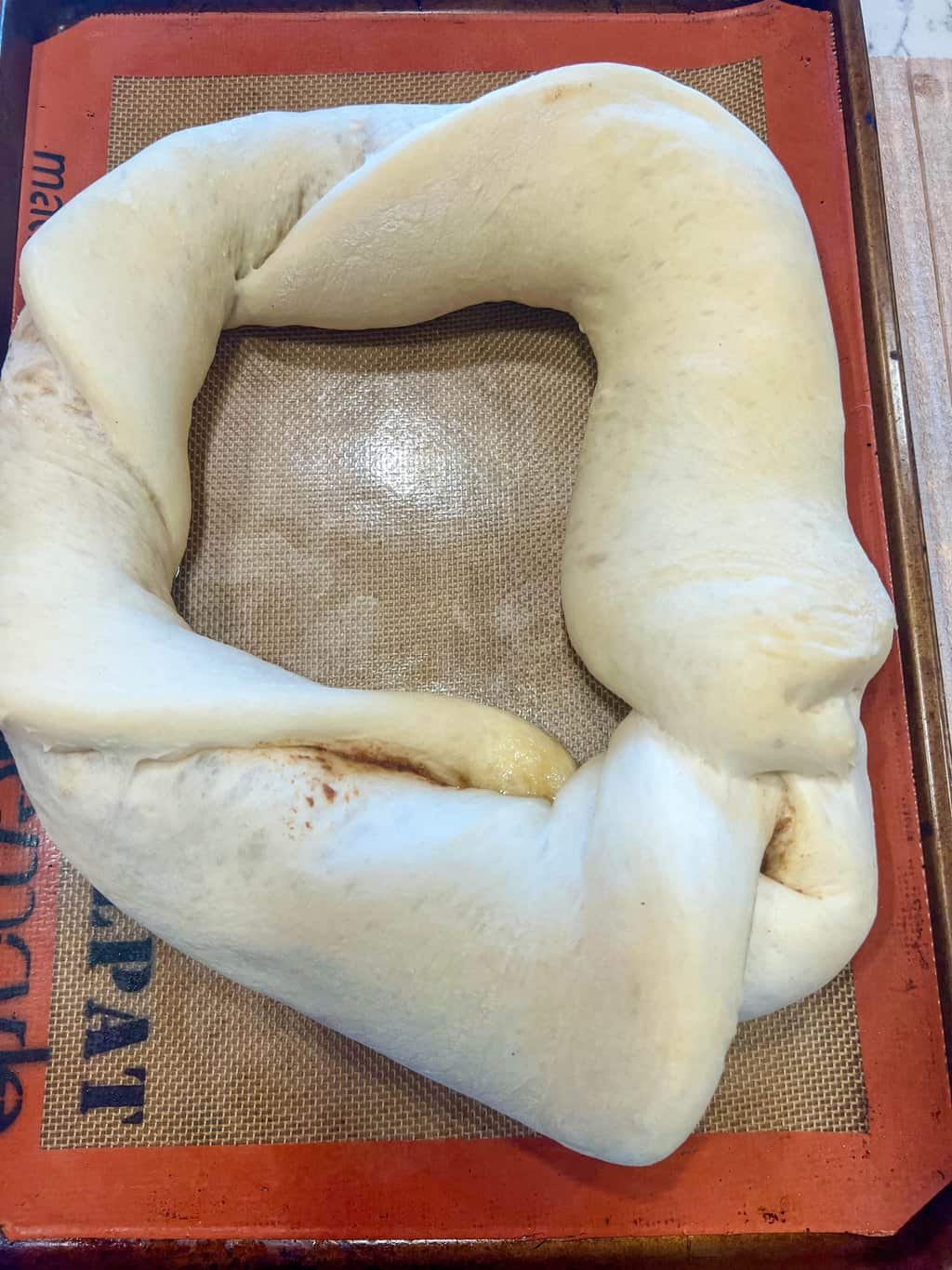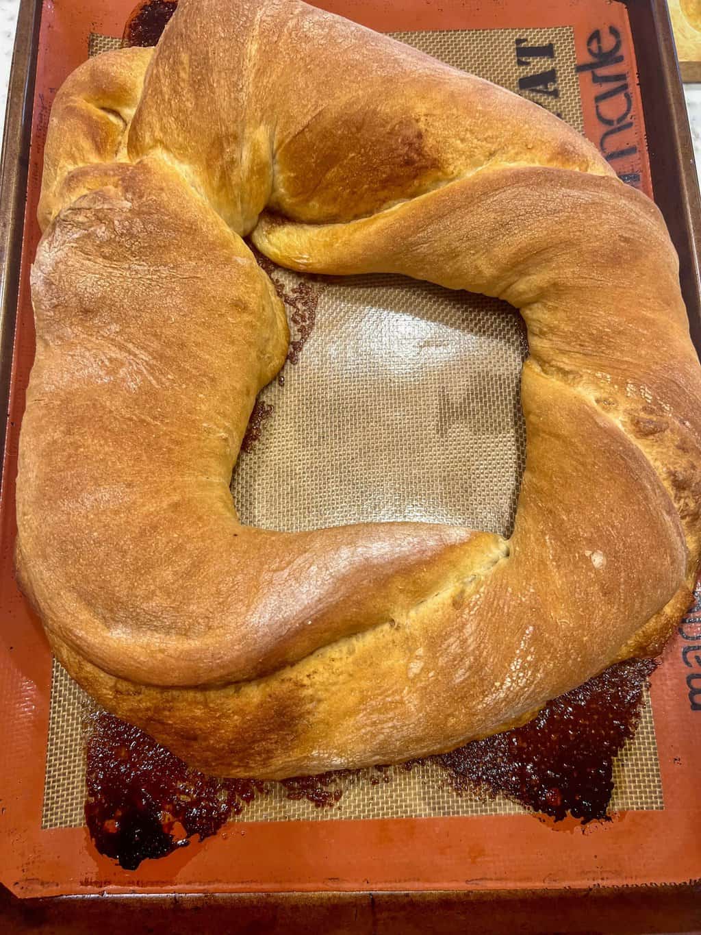 The cakes are formed into a ring symbolizing the unity of faiths. Sometimes they’re flavored with cinnamon and sugar, much like cinnamon rolls. They can also have a cream cheese filling. Using frozen bread dough makes this process easier and quicker without compromising any of the home-baked flavor.