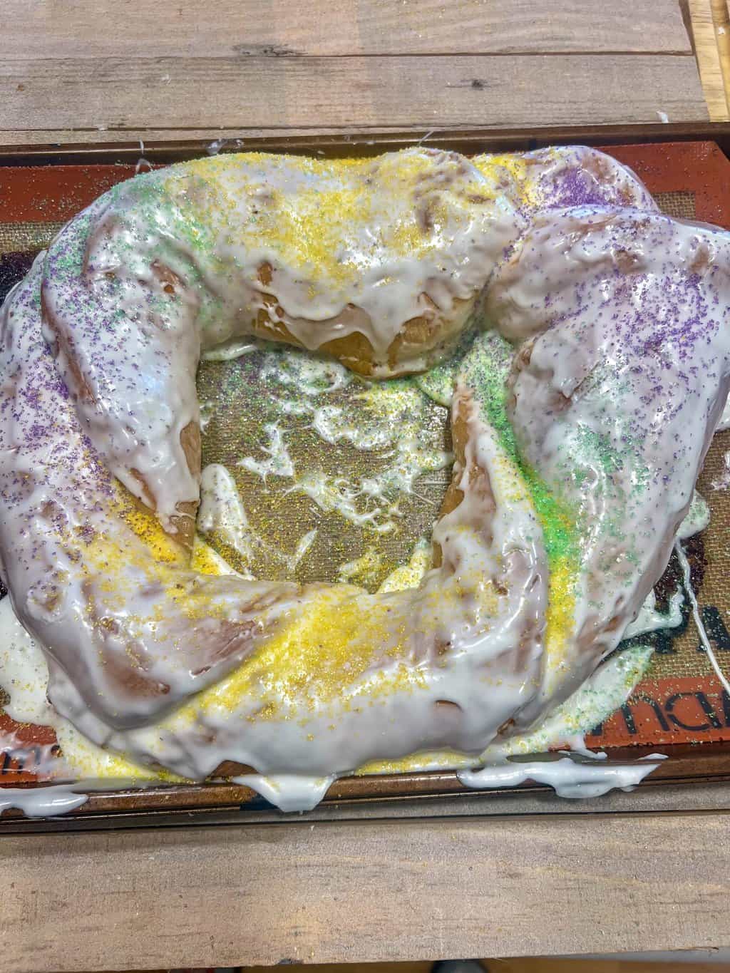 King Cake is a pastry filled with brown sugar cinnamon filling and decorated with colored sprinkles. The shape and colors of King Cake are symbolic of Epiphany and rooted in Christian history. The cake is popular during Mardi Gras season.