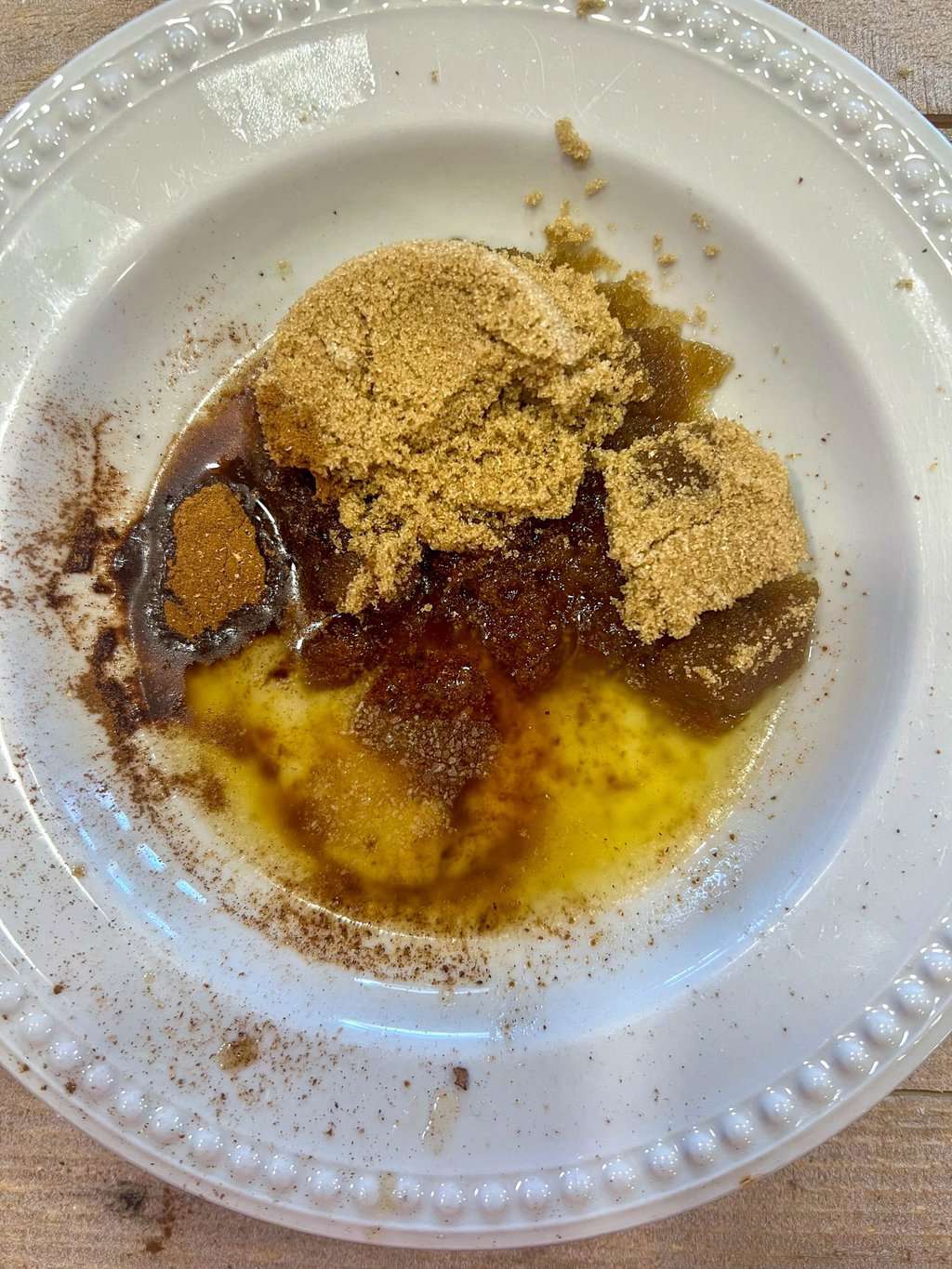 - Add brown sugar, cinnamon, nutmeg, ginger, and salt to the bowl.