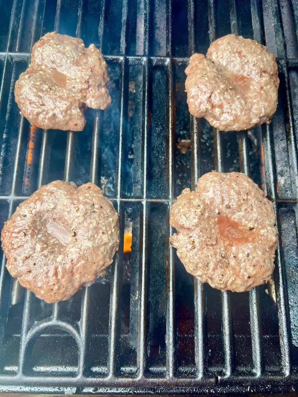 - Place indented side up on a grill preheated to medium high. Do not press down on the burgers while they’re cooking. Let them cook for at least four minutes UNDISTURBED. This means don’t mess with them. Leave them alone for four minutes. The only exception to this rule is if your grill catches on fire. You will need to spring into action to save more than your burgers. Cook on first side about 4 minutes or until juices start to accumulate on the top surface.