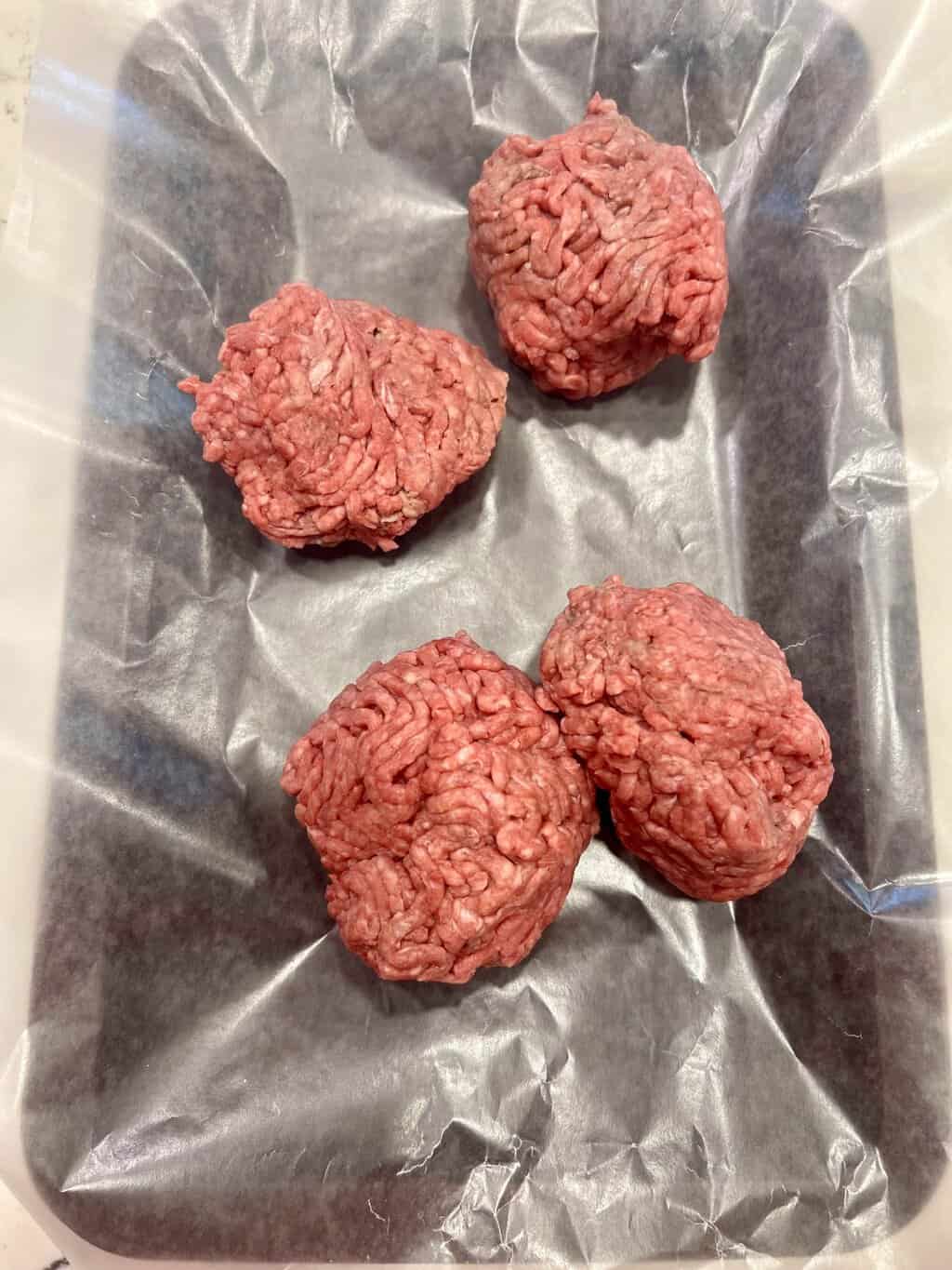 - shape four patties from one pound of hamburger meat. Use 1/4 of the ground beef and shape into a ball. Press it out in your hands to about 1/2 of an inch. Gently. Don't pound it or bounce it off the counter tops. Gently form the patty.