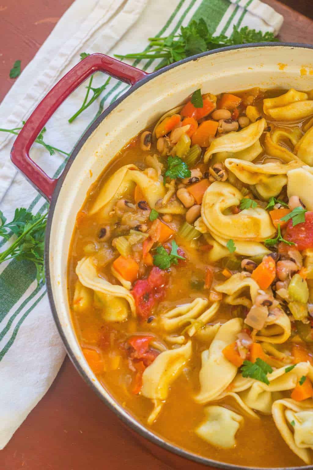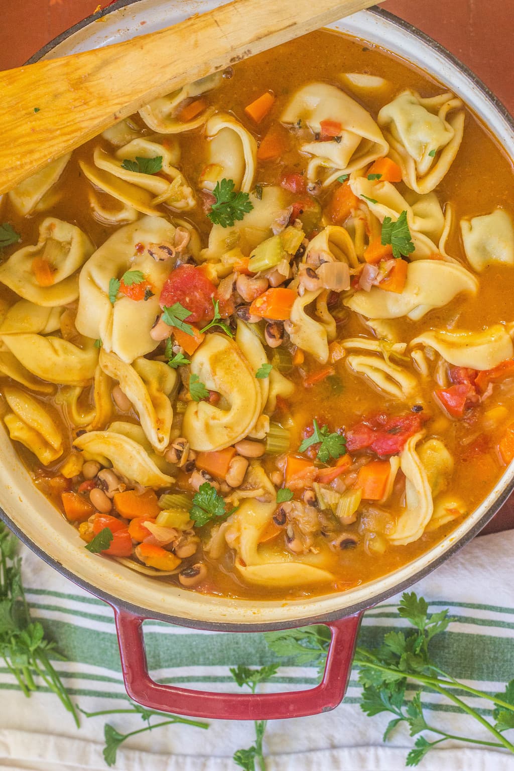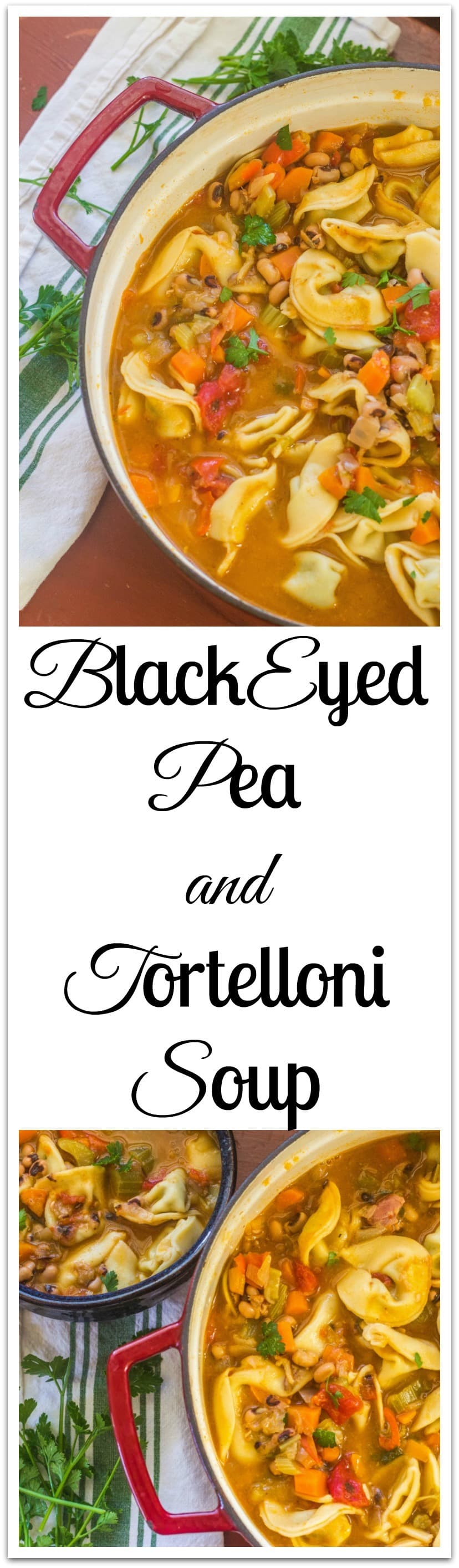 Blackeyed Pea and Tortelloni Soup. Chocked full of savory vegetables, blackeye peas and tortelloni filled with ricotta cheese and spinach.