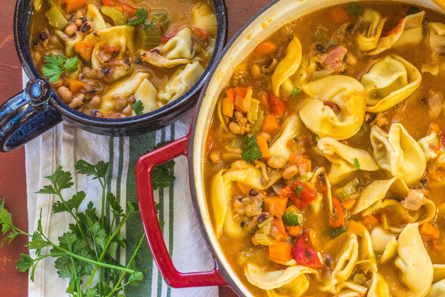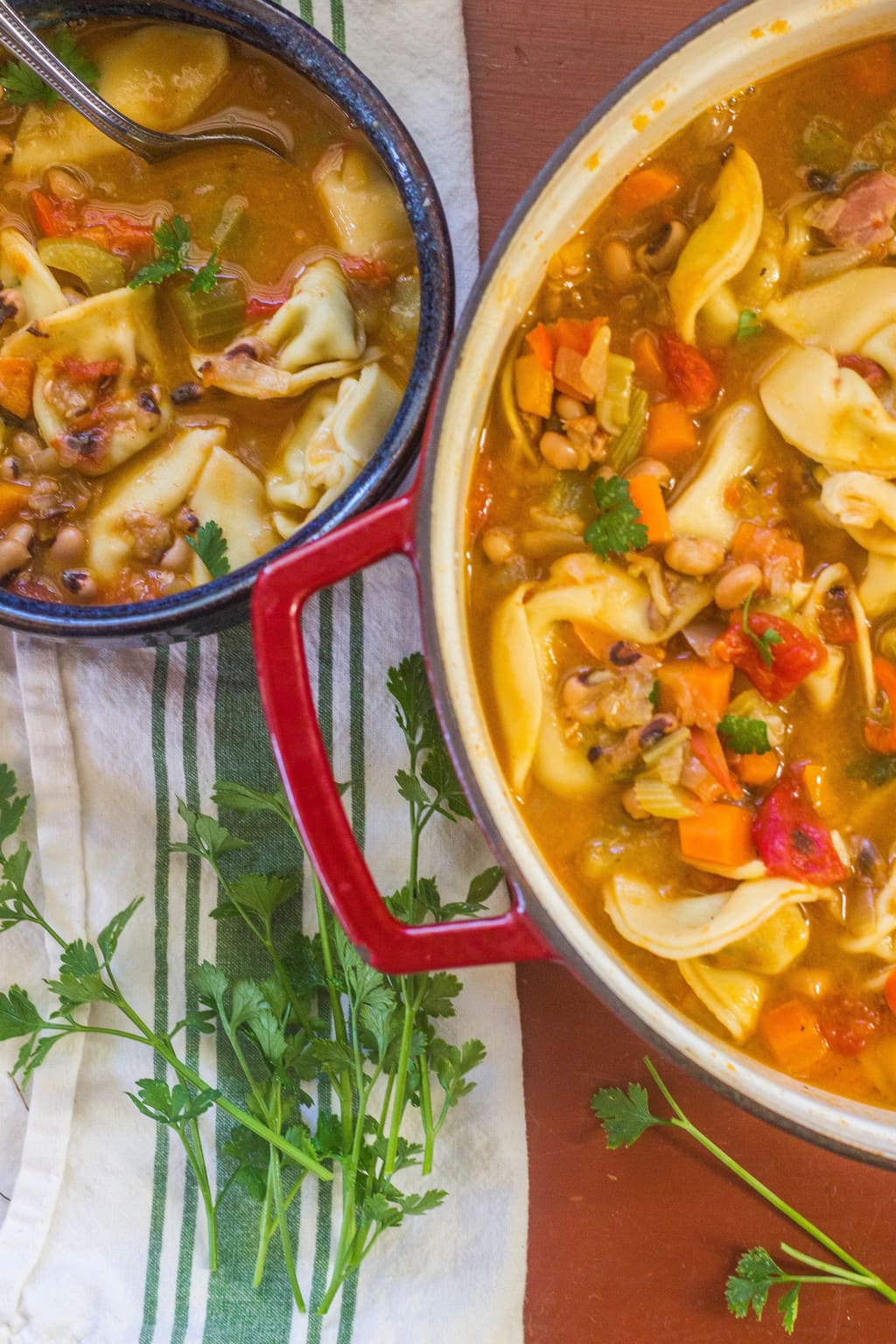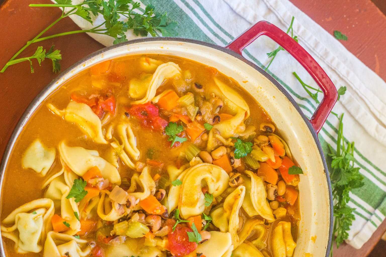 Few dishes have a more Southern ring than black-eyed peas and greens. Both are part of our traditional New Year’s Day menu. With inspiration from those iconic dishes, I’ve come up with a little rift I’d like to share with you. How ’bout a nice bowl of steaming Black-Eyed Pea and Tortelloni Soup?