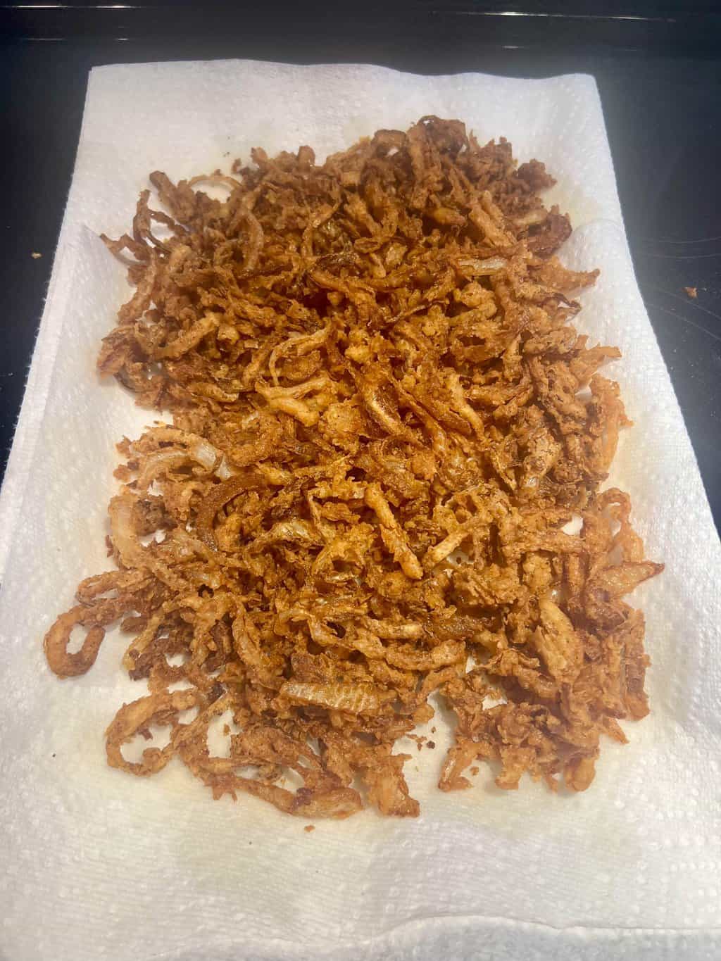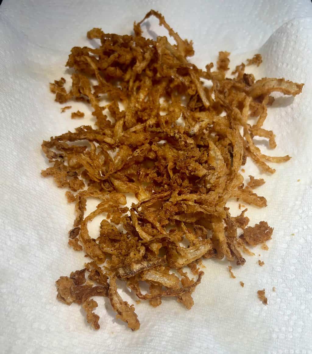- As soon as they are to the shade of golden brown you like, remove them with a slotted spoon to a paper towel lined tray. Spread in an even a layer so they’ll drain better.