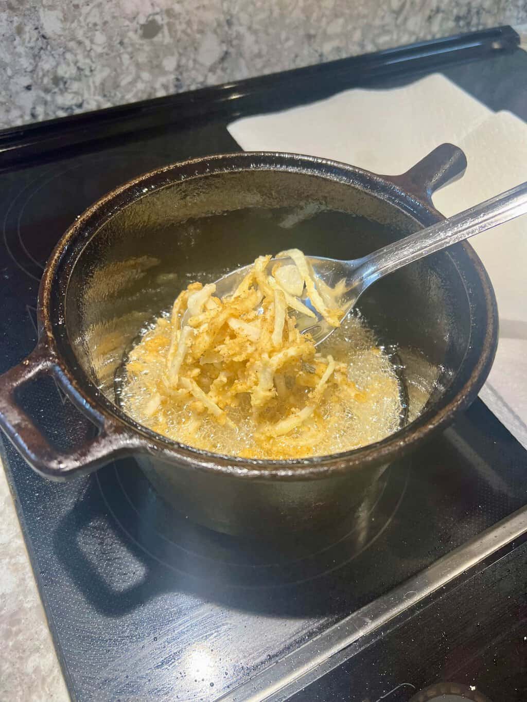 - Working in batches, drop the breaded onions into the preheated oil. Stir continuously to help the onion pieces break apart. Once they start browning, they’ll go quickly. Don’t get distracted or walk away. They only need about 4 minutes to brown.