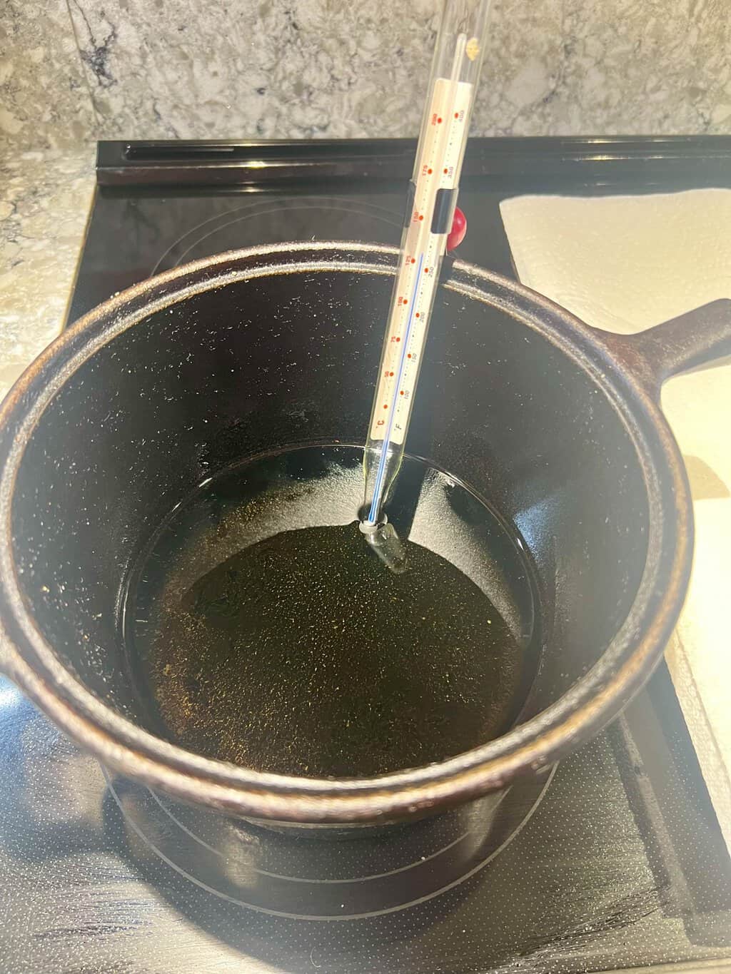 - In a pot or kettle that has deep sides, heat about 2 to 3 inches of cooking oil to 350 degrees. Ensure that you have a deep pot because the hot oil will bubble up quite a bit due to the high water content of the onions. Using a shallow pot might result in a spillover of hot oil. Be careful!