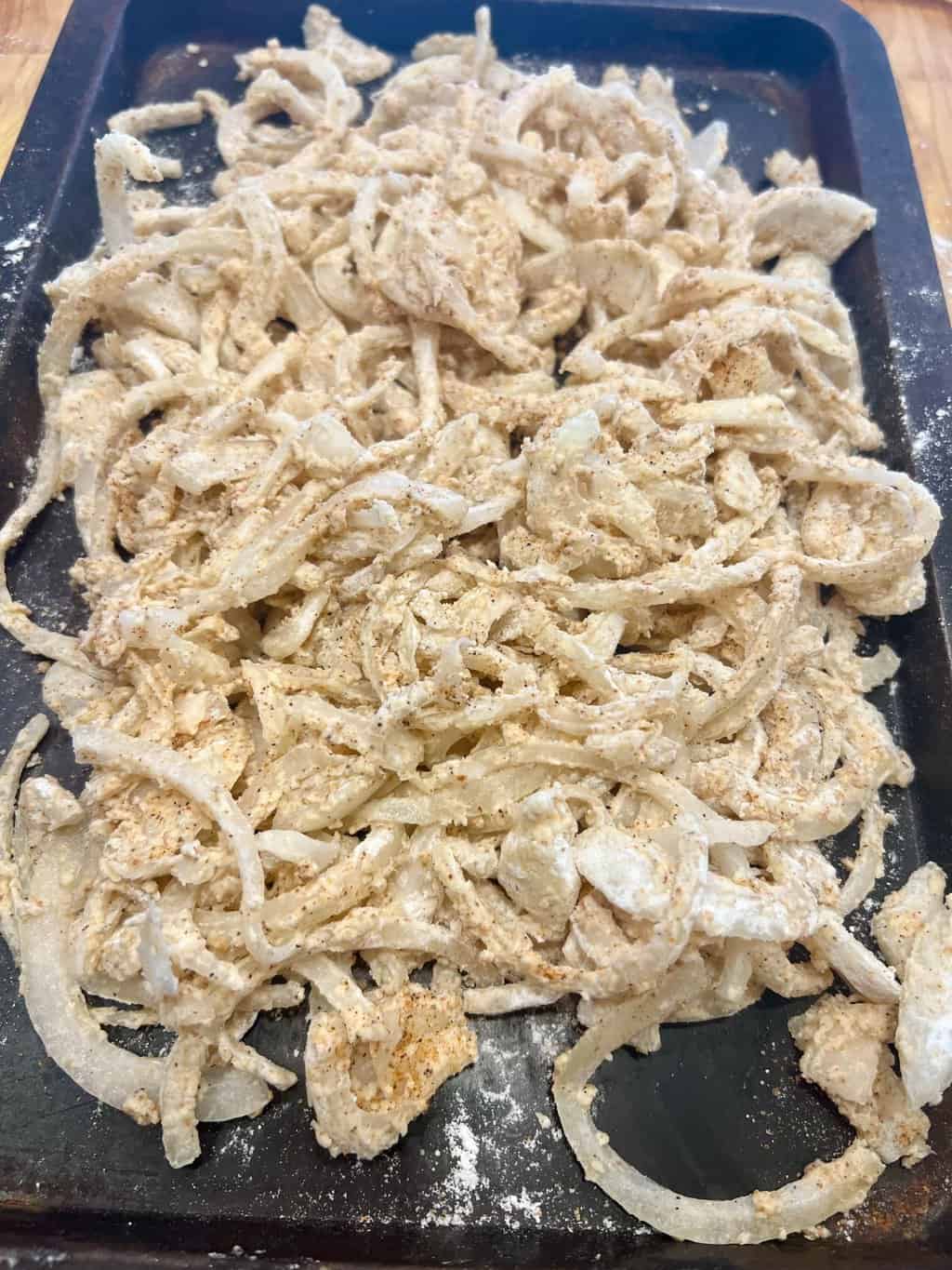 - Add to bag of onions and toss well to coat all the onions. Pour the onions coated with seasoned flour onto a tray. Sprinkle with additional flour as needed to ensure the onions are well coated.