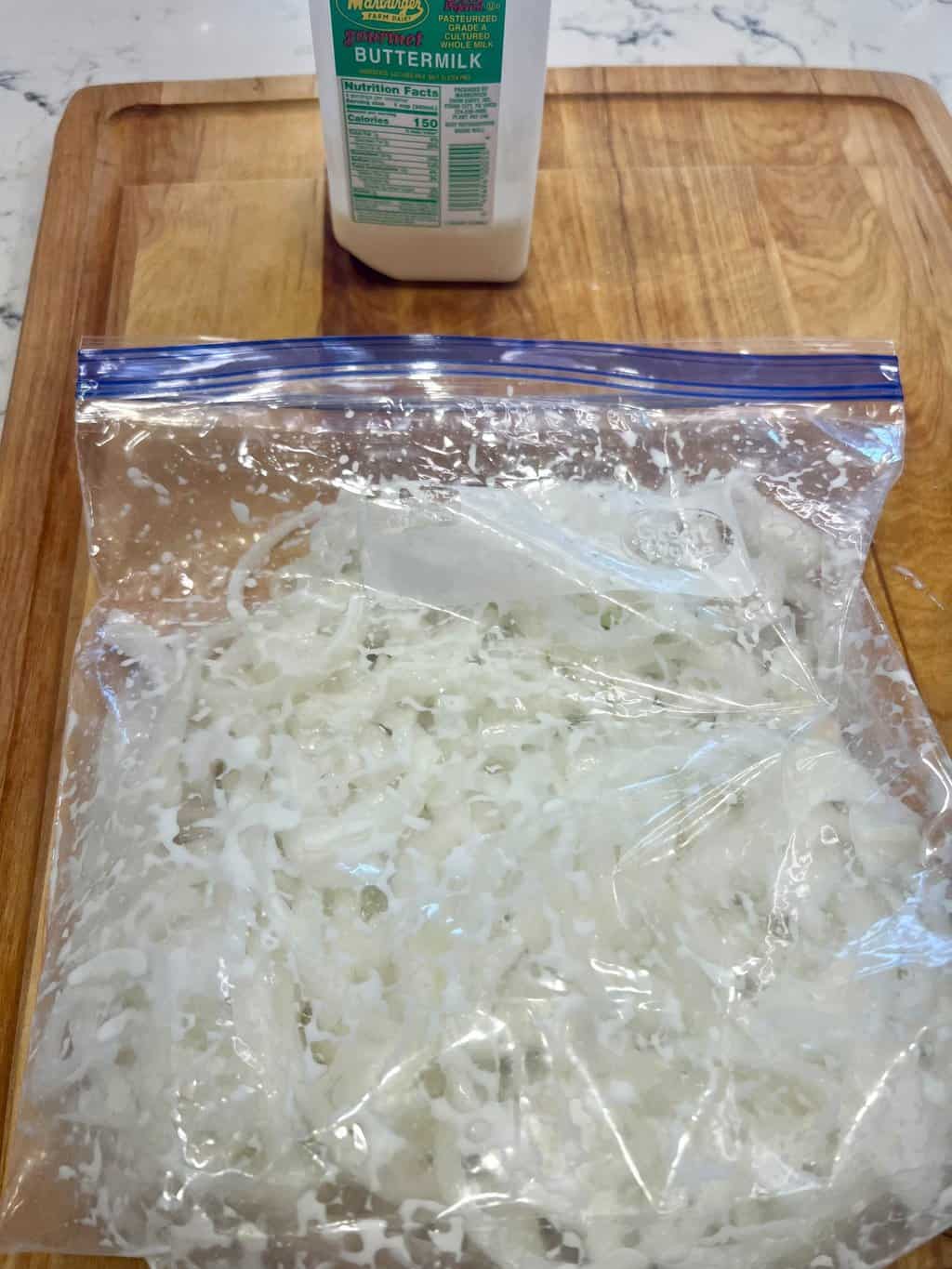 - Pour in buttermilk and make sure the onion slices are well coated. This will help the flour adhere to the onion slices better.