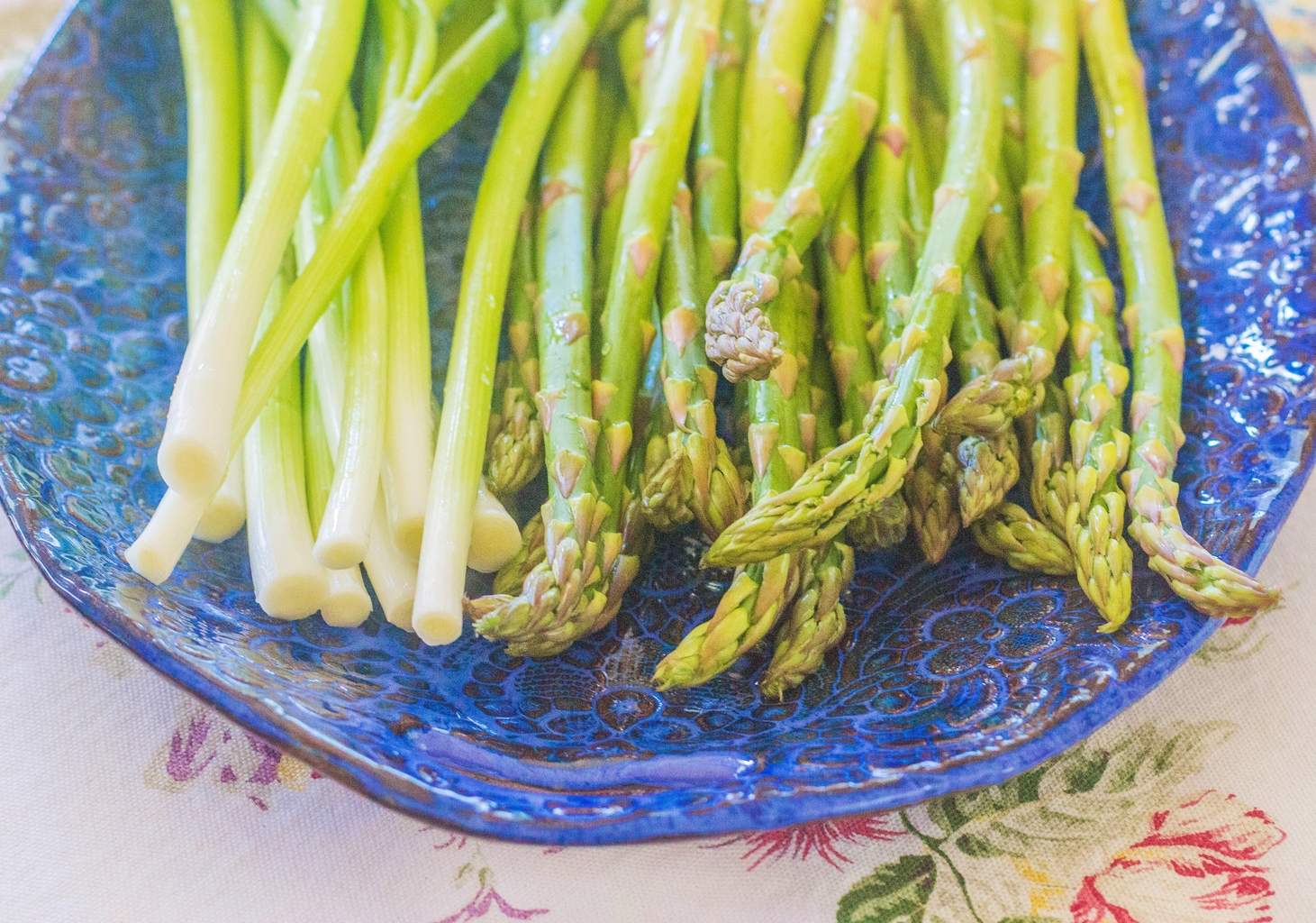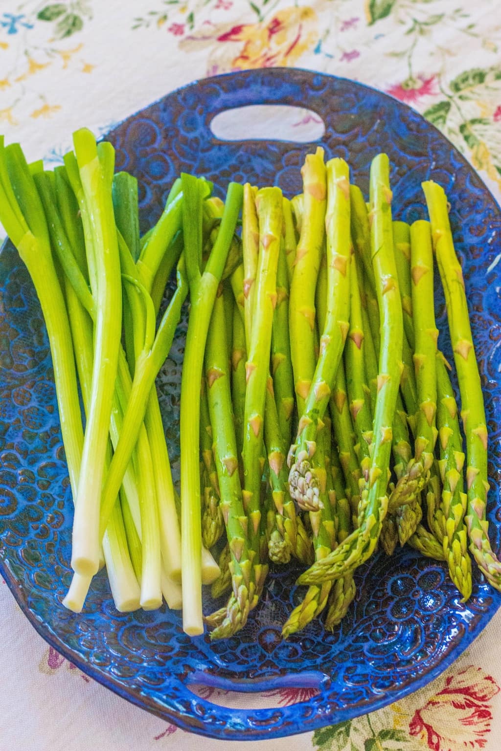 - Find the prettiest serving platter you own (or borrowed). Arrange the asparagus and onions lengthwise on the platter. Drizzle the dressing over the vegetables.