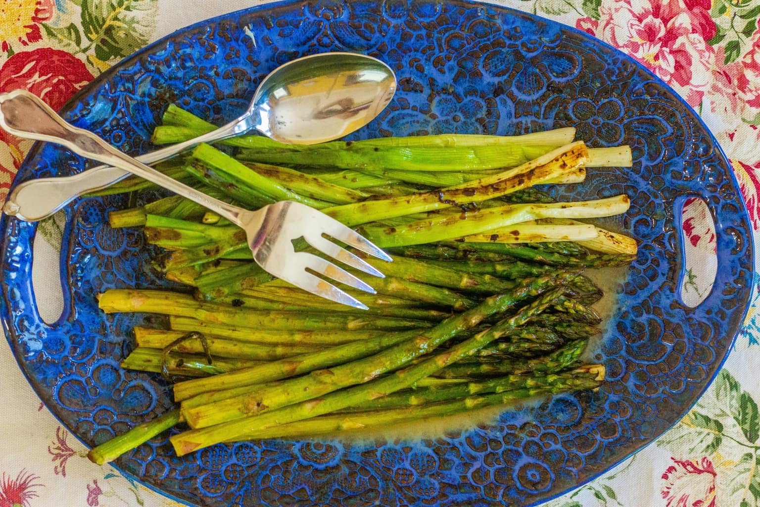 - Place the lightly cooked asparagus back in the same serving platter. There's dressing on the bottom of the platter and you want that to coat the vegetables.