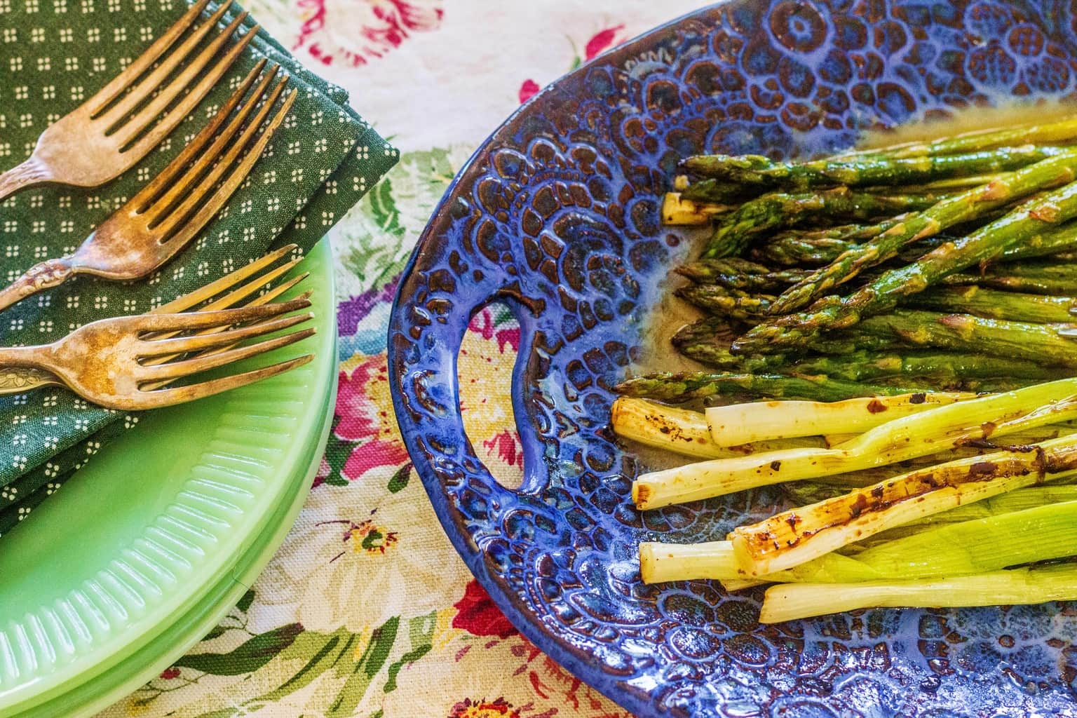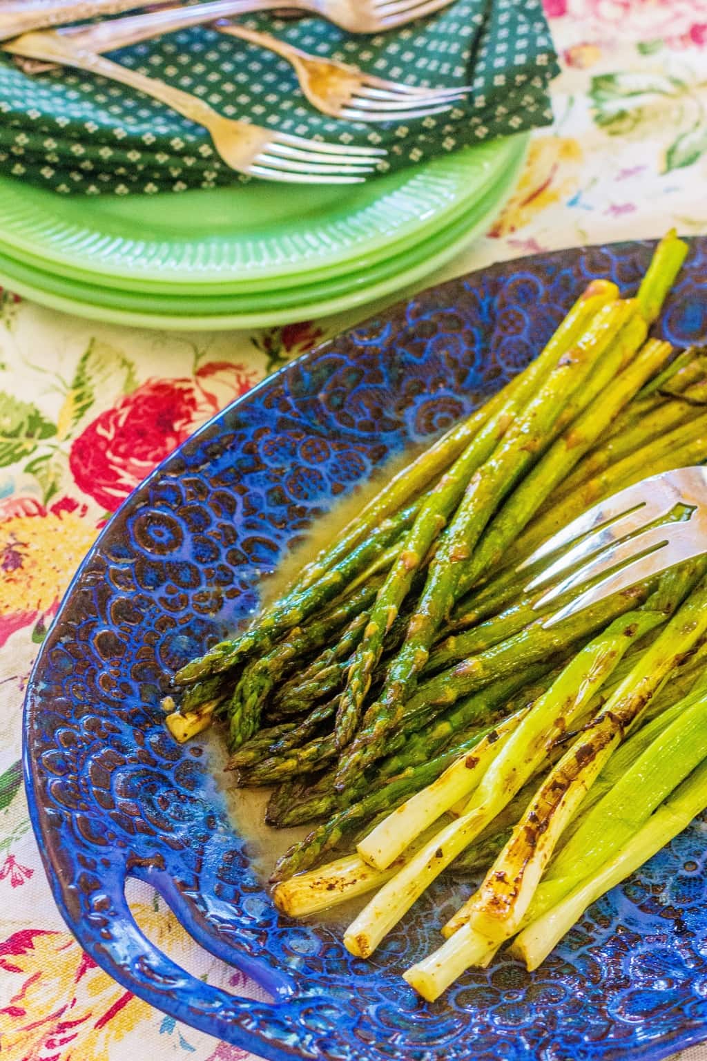 It’s easy to get confused about seasons of the year when you live in Florida. That’s because we don’t have a full set of seasons. We only have a piece of a set. When the rest of the our country thinks it’s winter, we play along for laughs and try not to gloat about standing in our front yard in the middle of January barefooted and in shorts. During March, April, and May when the rest of y’all are thinking about spring planting, we’re on the tail end of growing season. So, it’s hard for me to relate to anything considered a spring vegetable. Chances are, we grew them in the winter. Grilled Asparagus and Spring Onions with Honey Lime Vinaigrette might seem like spring vegetables to most of you. We Florida residents know what you mean but we have to re-calibrate our thinking to align with the fact that our growing seasons are backwards from the rest of y’all.