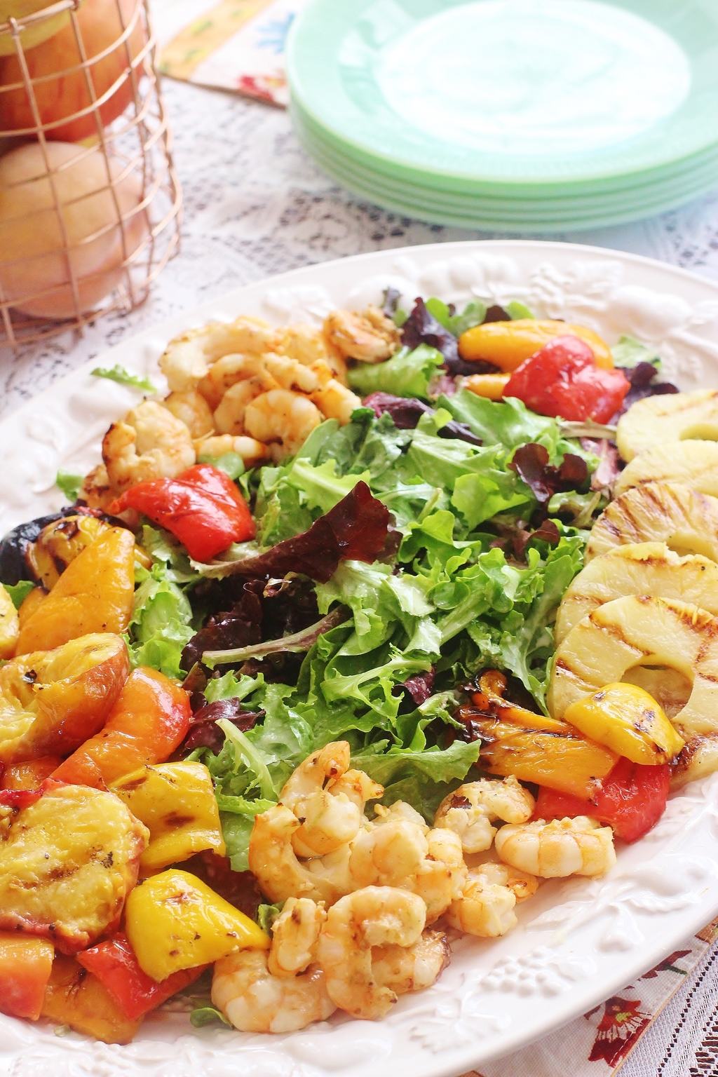Summertime, big salads and friends over for lunch. That’s an awesome trio in my book! I felt I was long overdue in treating my friends to lunch. I created a special menu, just for them, around the theme of summer fruits. Grilled Shrimp and Fruit Salad was the key player.