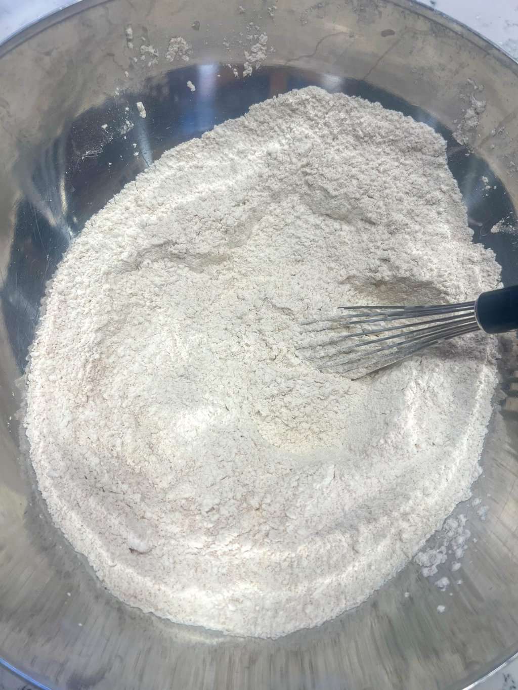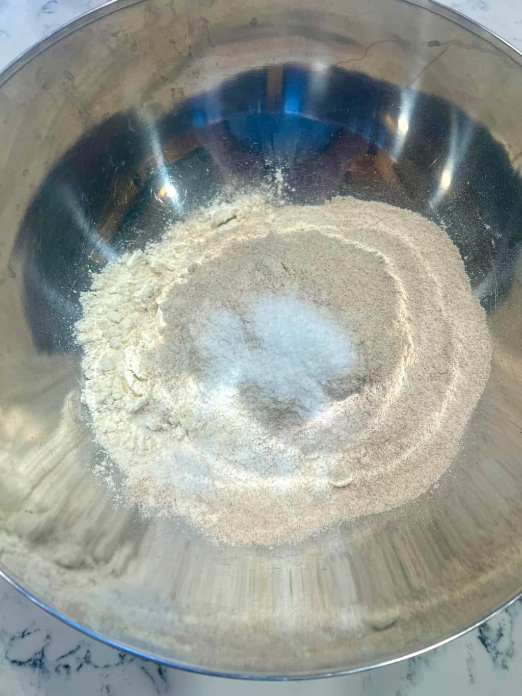 - Place both types flour and salt in a large mixing bowl and whisk.