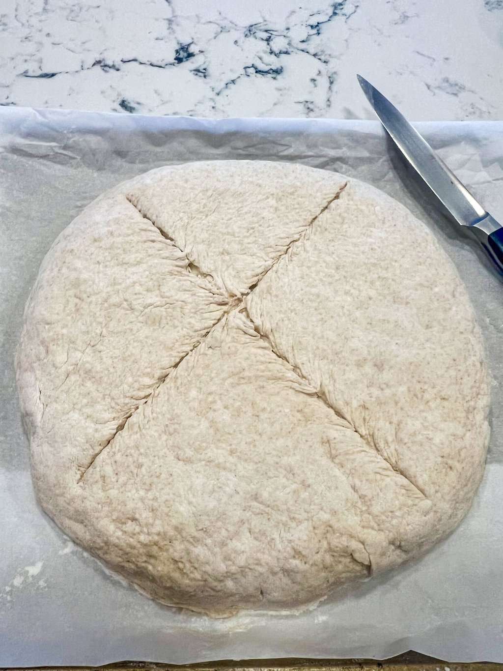 - Using a sharp knife, make an X one quarter inch deep in the top of the dough.
