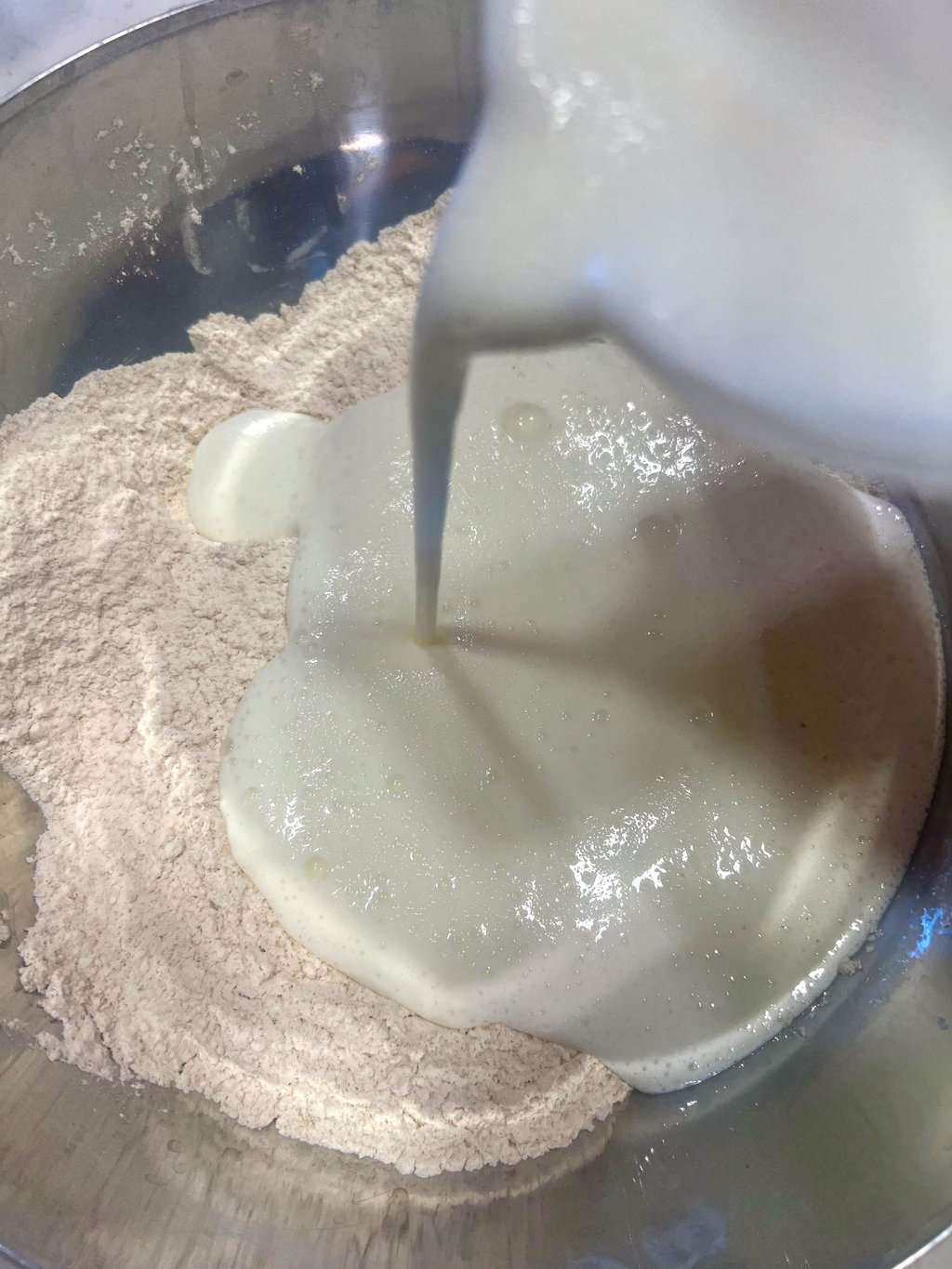 - Pour in buttermilk and soda. Stir until the flour is wet.