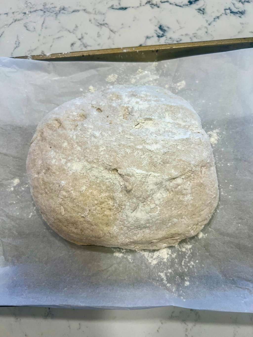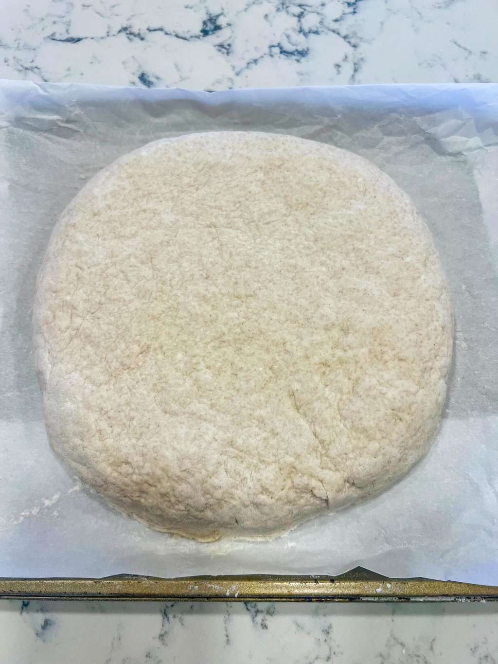 - Form into a ball and place on a baking sheet covered with parchment paper or a baking mat. With hands, shape into a round disk that’s approximately 1 1/2 inches thick.