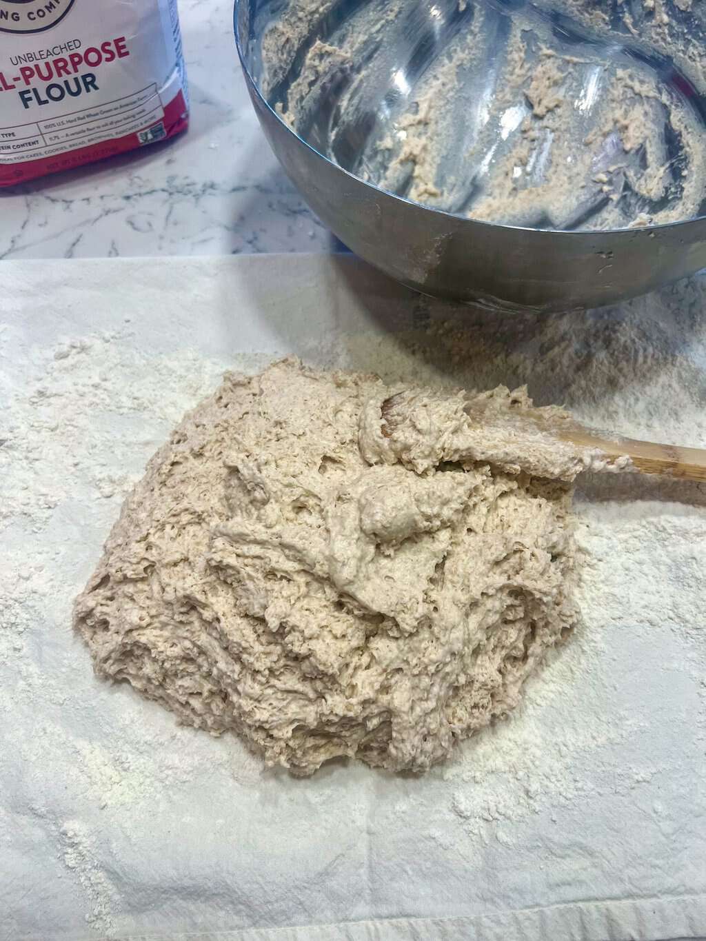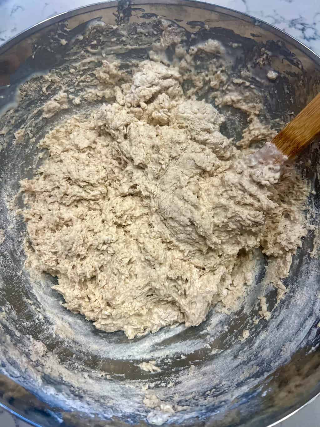 - Stir with large spoon or spatula until all the flour is wet. The dough will be sticky and craggy.