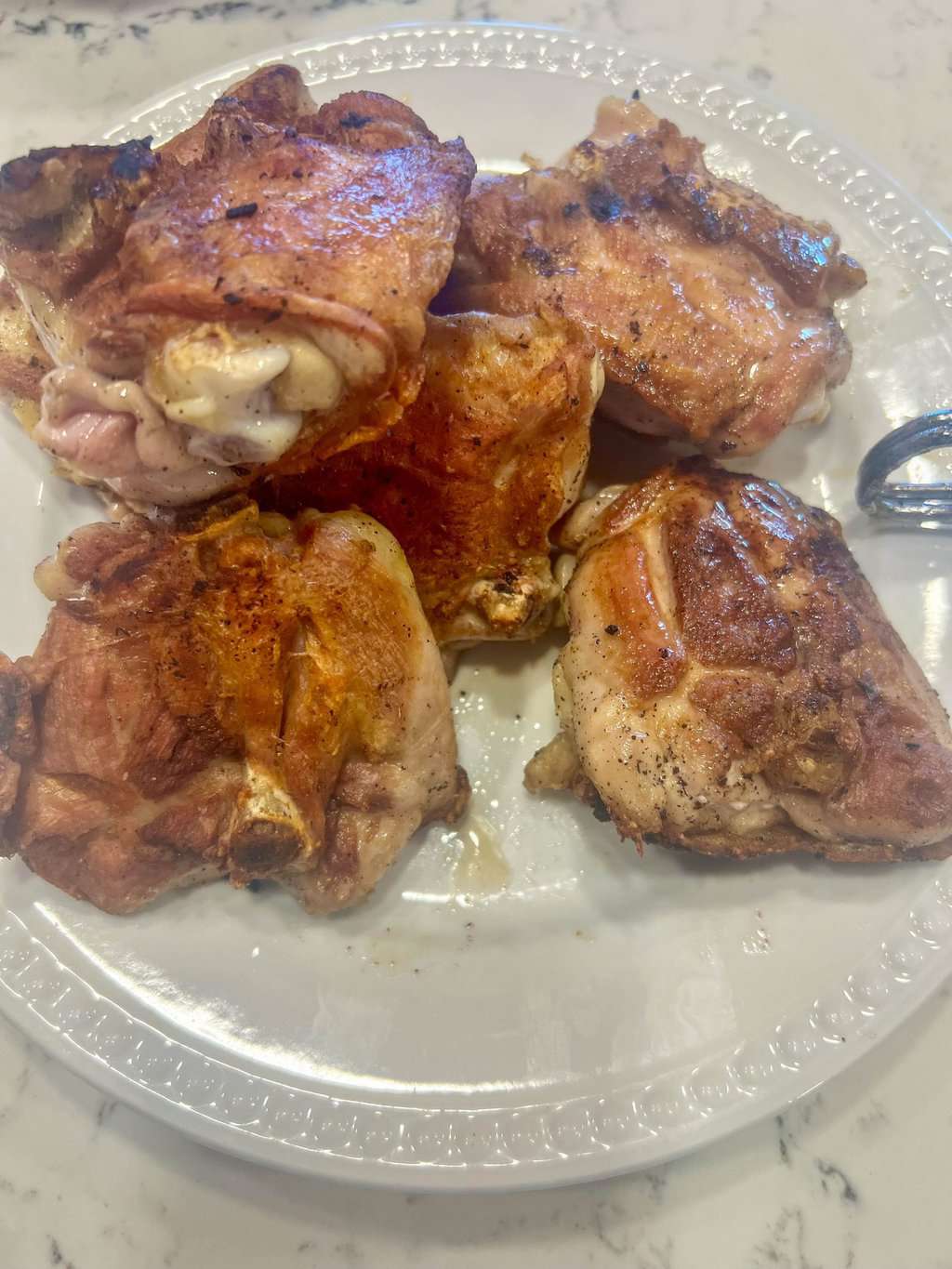 - Drain bacon grease and wipe down Dutch oven. Add one tablespoon of cooking oil to Dutch oven. Add chicken thighs, skin side down, to Dutch oven. Cook 5 -7 minutes or until skin is crispy and brown. Pay careful attention that the chicken skin doesn’t burn. Flip and cook remaining side 2-3 minutes or until brown. Work in batches, if necessary, to prevent overcrowding. If the cooking oil starts turning too dark between batches, discard it and add more to the pan.