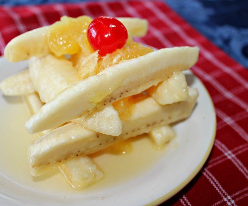 Cut bananas in half and each half into 4 spears yielding 8 spears per banana. Marinate sliced bananas in orange juice, covering each spear, for 5 minutes to prevent oxidation.