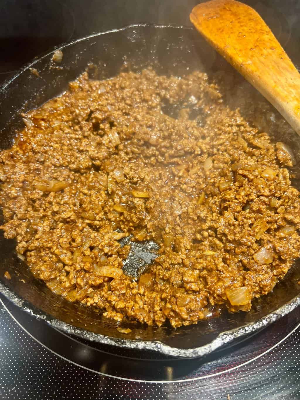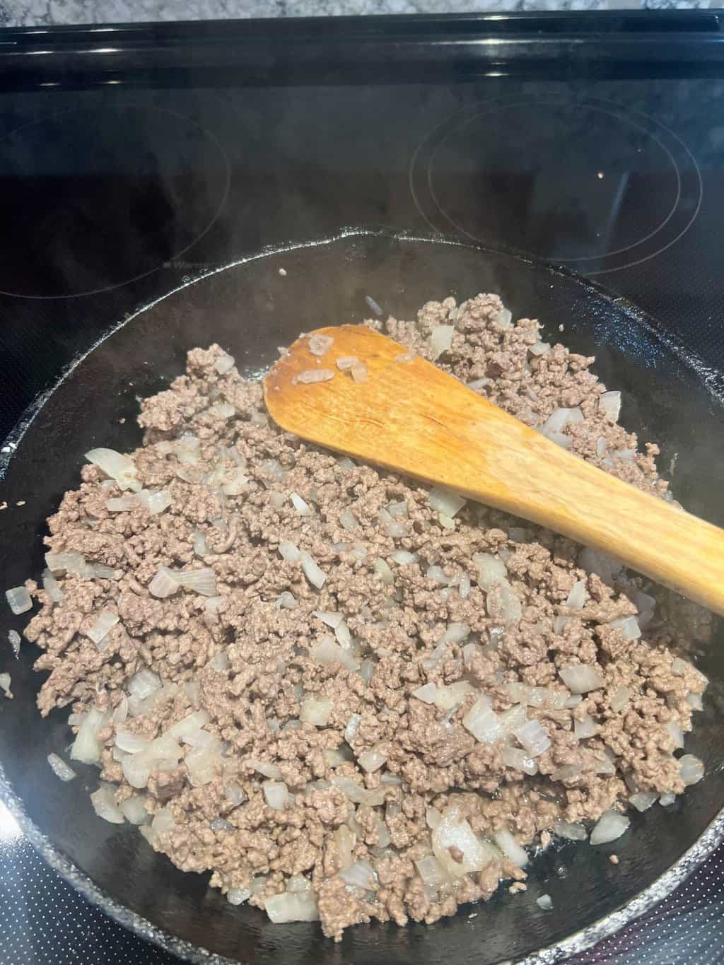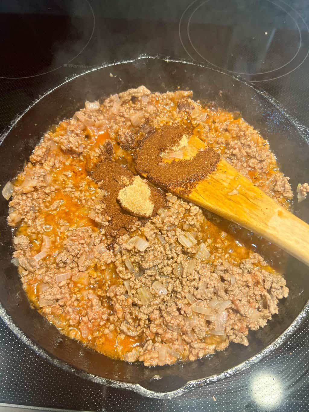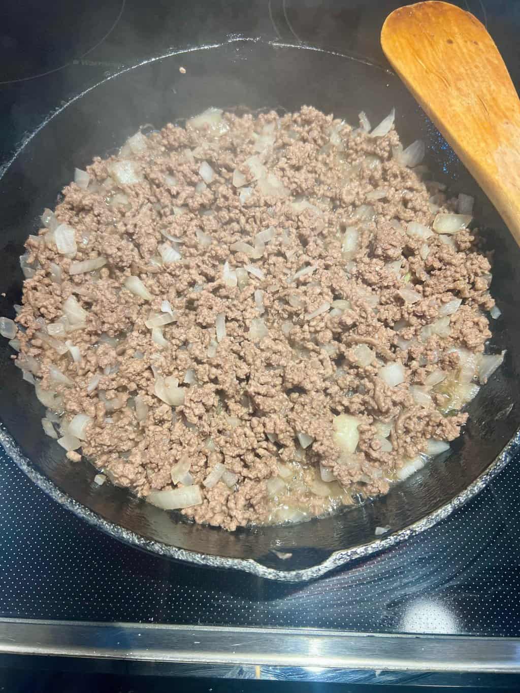 - Heat a 10 inch cast iron skillet over medium heat. When hot, add ground beef and onions. Stir frequently to brown and crumble. When done, remove some of the excess grease by draining or dabbing with paper towel.
