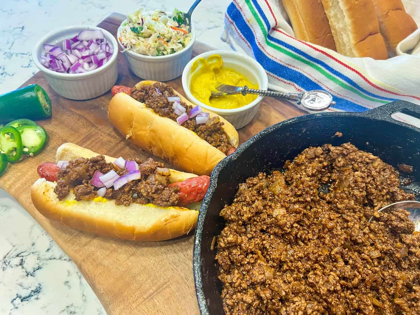 Elevate your hot dog game with this quick and easy Skillet Hot Dog Chili.