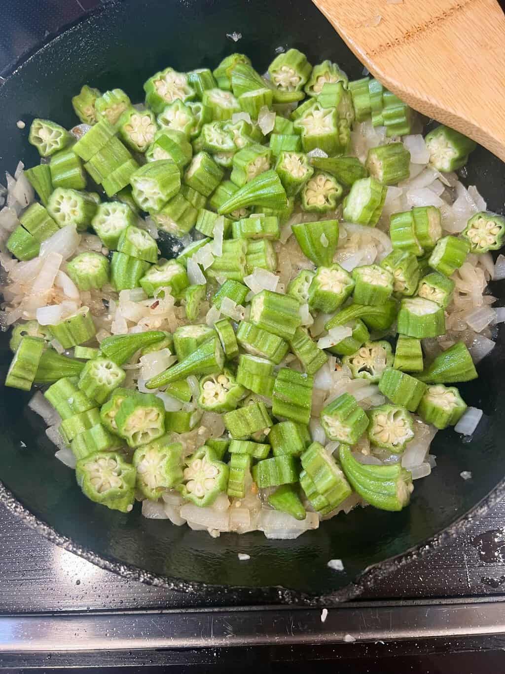 - Add sliced okra to skillet with onions, garlic, and bacon grease. Sauté for five minutes, stirring frequently to coat okra slices with bacon grease which will keep the okra from becoming slimy.