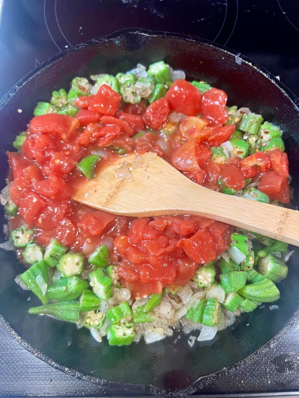- Add canned diced tomatoes, including juice, and stir. Sauté for an additional 10 minutes or until the okra is cooked to the degree of tenderness to your liking.