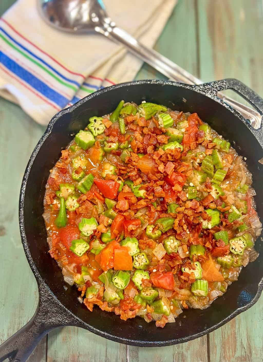 Hey Hey! This dish looks really good. It’s a good one for first time okra eaters like my husband Jim to try. The bacon onion and jalepeno are the key here I think!