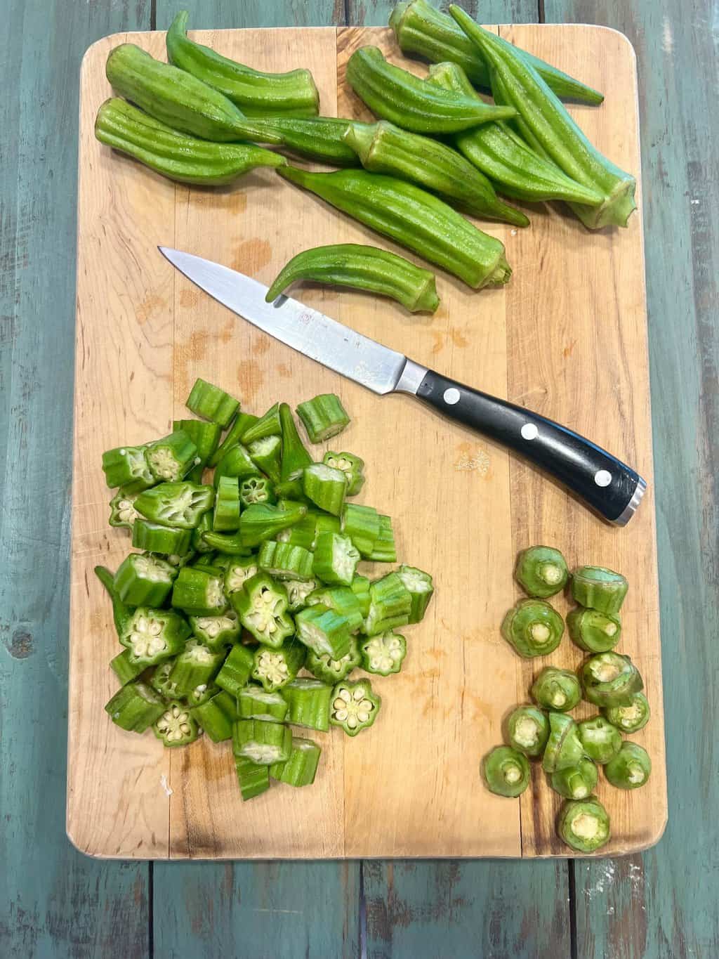 - Remove the stem end from okra pods and discard. Slice pods into 1/2 inch rounds.