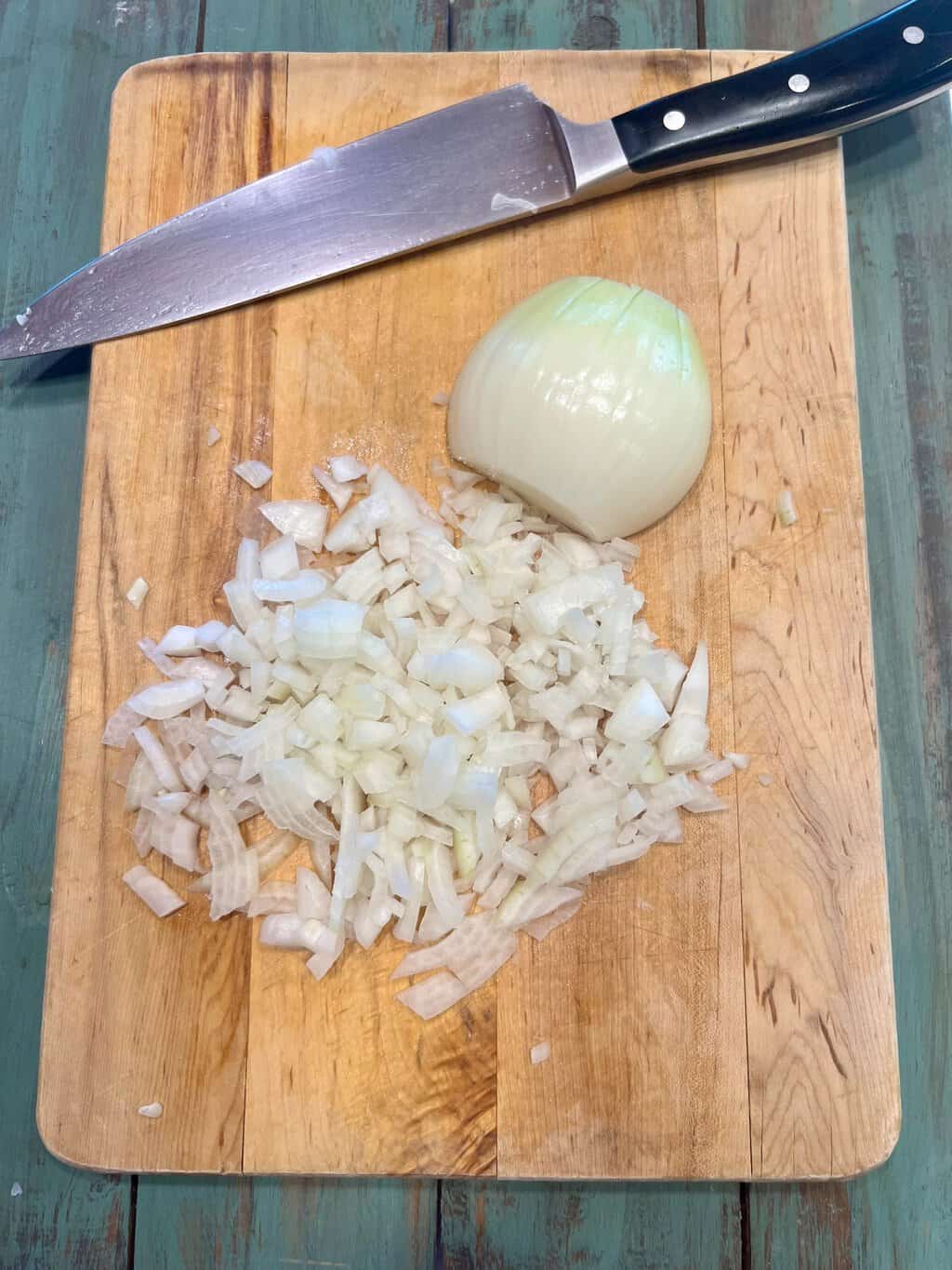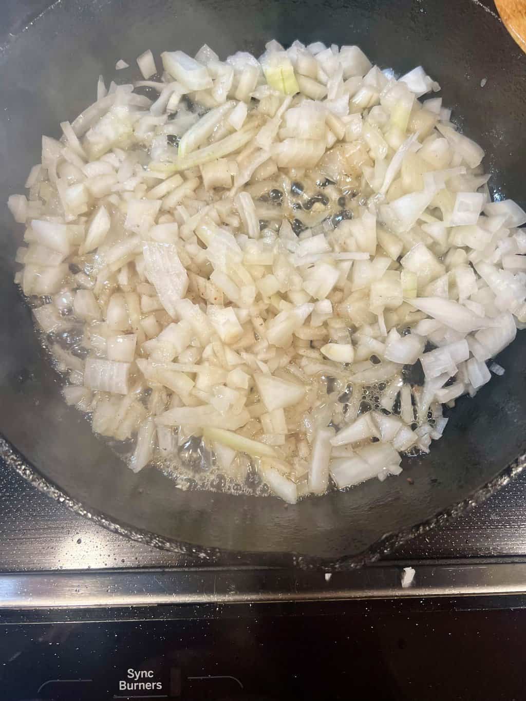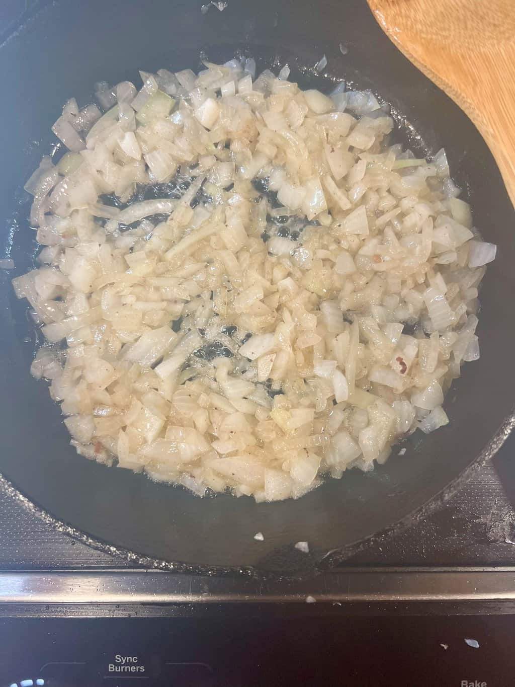 - Add diced onion to skillet with bacon drippings and sauté on medium heat for five minutes until onions soften.