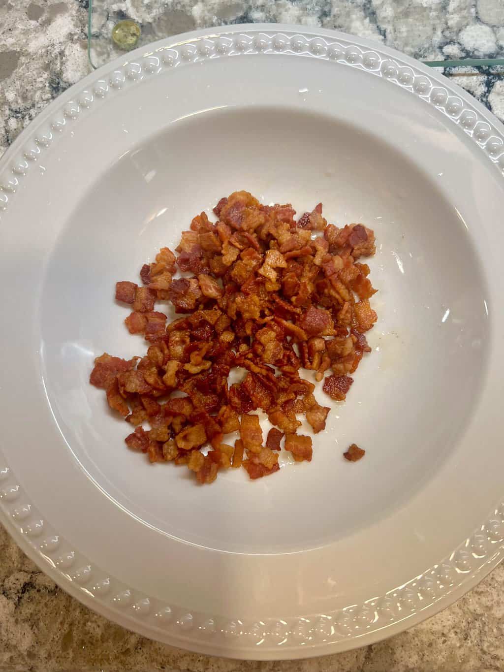 - With a slotted spoon, remove crispy bacon to a bowl and set aside.