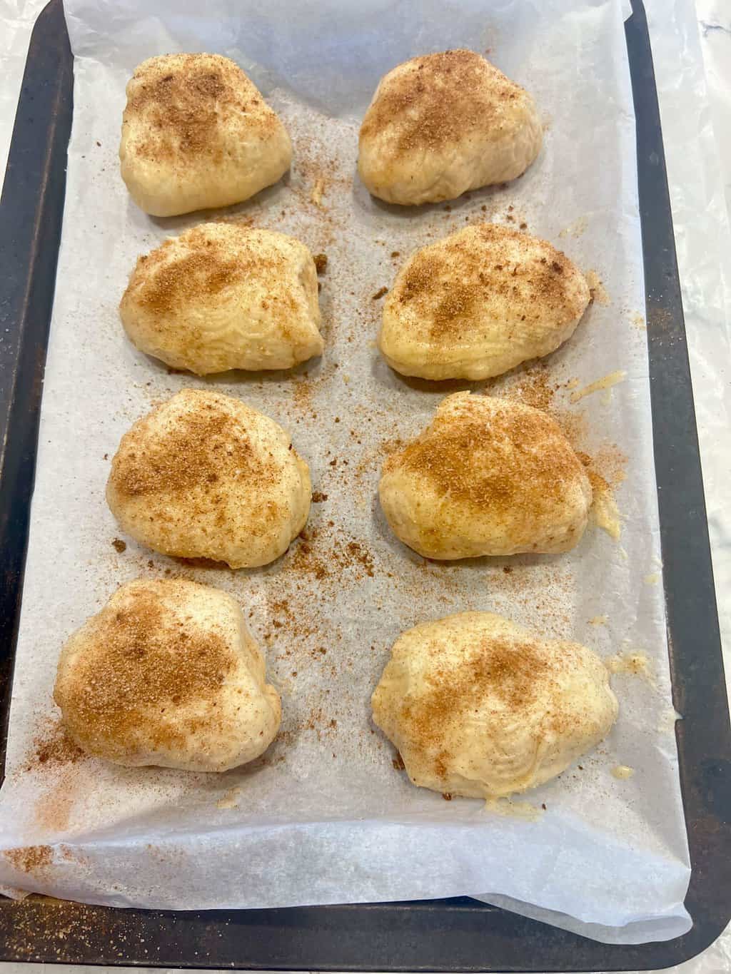 - Sprinkle with leftover sugar/cinnamon mixture.