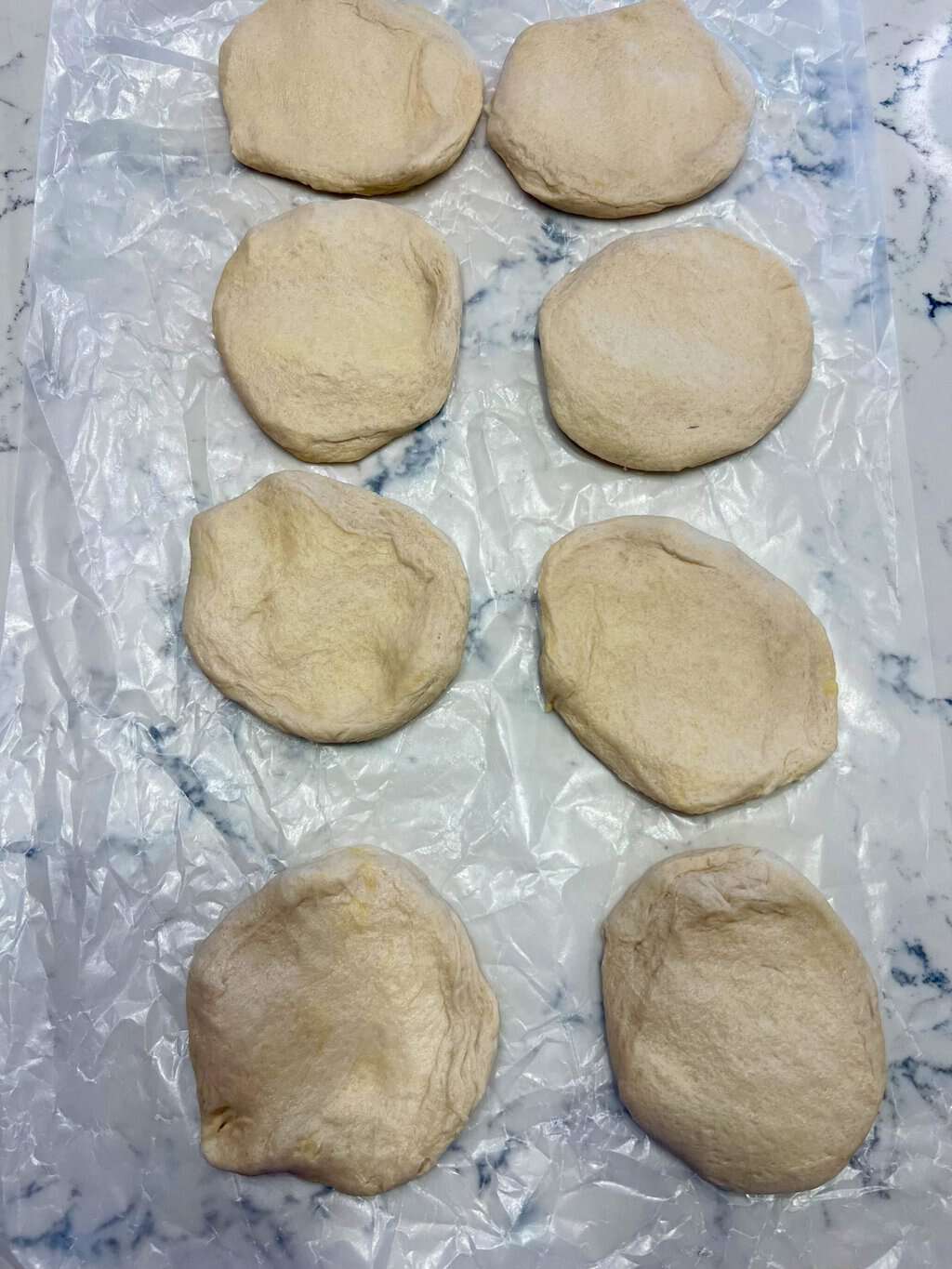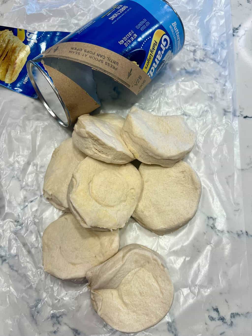 - Open canned biscuits and flattened each one with the heal of your hand.