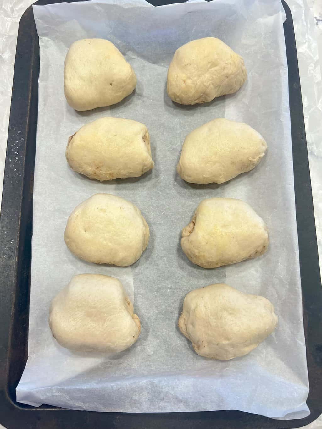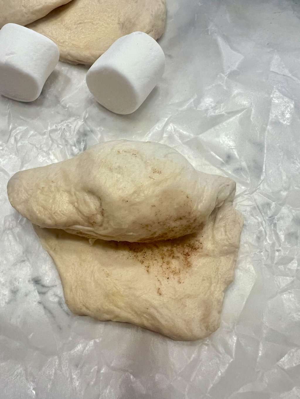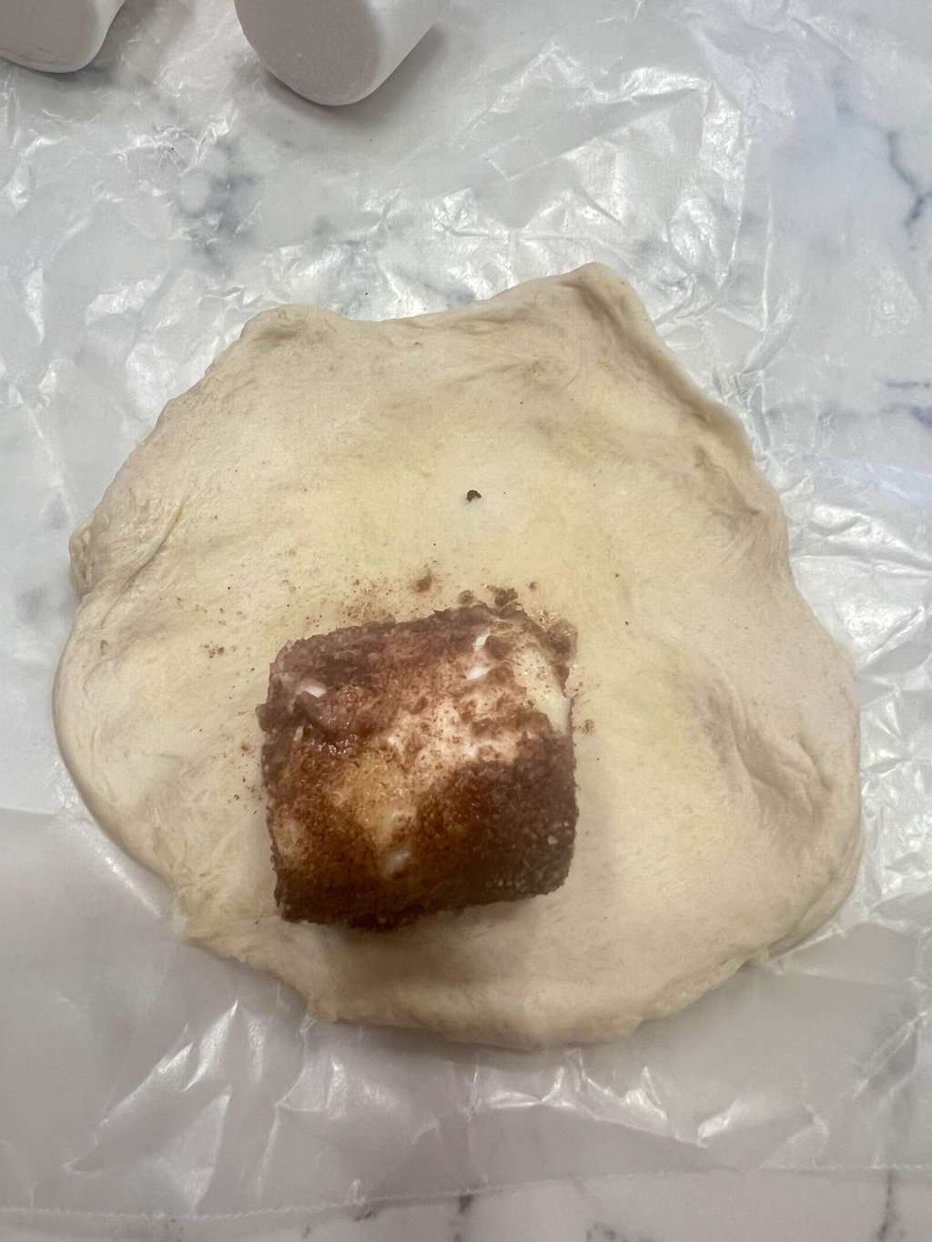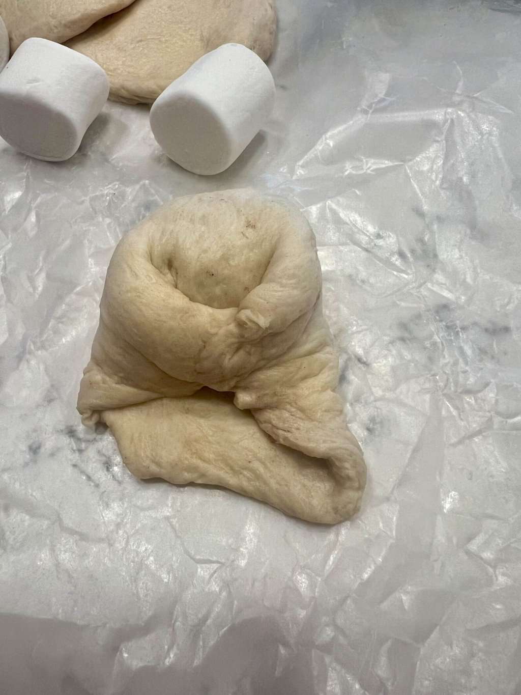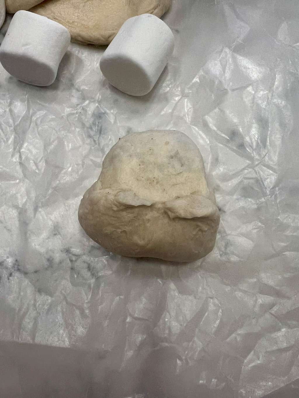 - Place the coated marshmallow on the inside of the biscuit near the edge. Roll the biscuit up and around the marshmallow one half turn. Fold in the edges of the biscuit. Finish rolling. Pinch seams and place seam side down on a baking sheet that has been greased or covered in a baking mat. Make sure seams are pinched together well or the marshmallow will leak out.