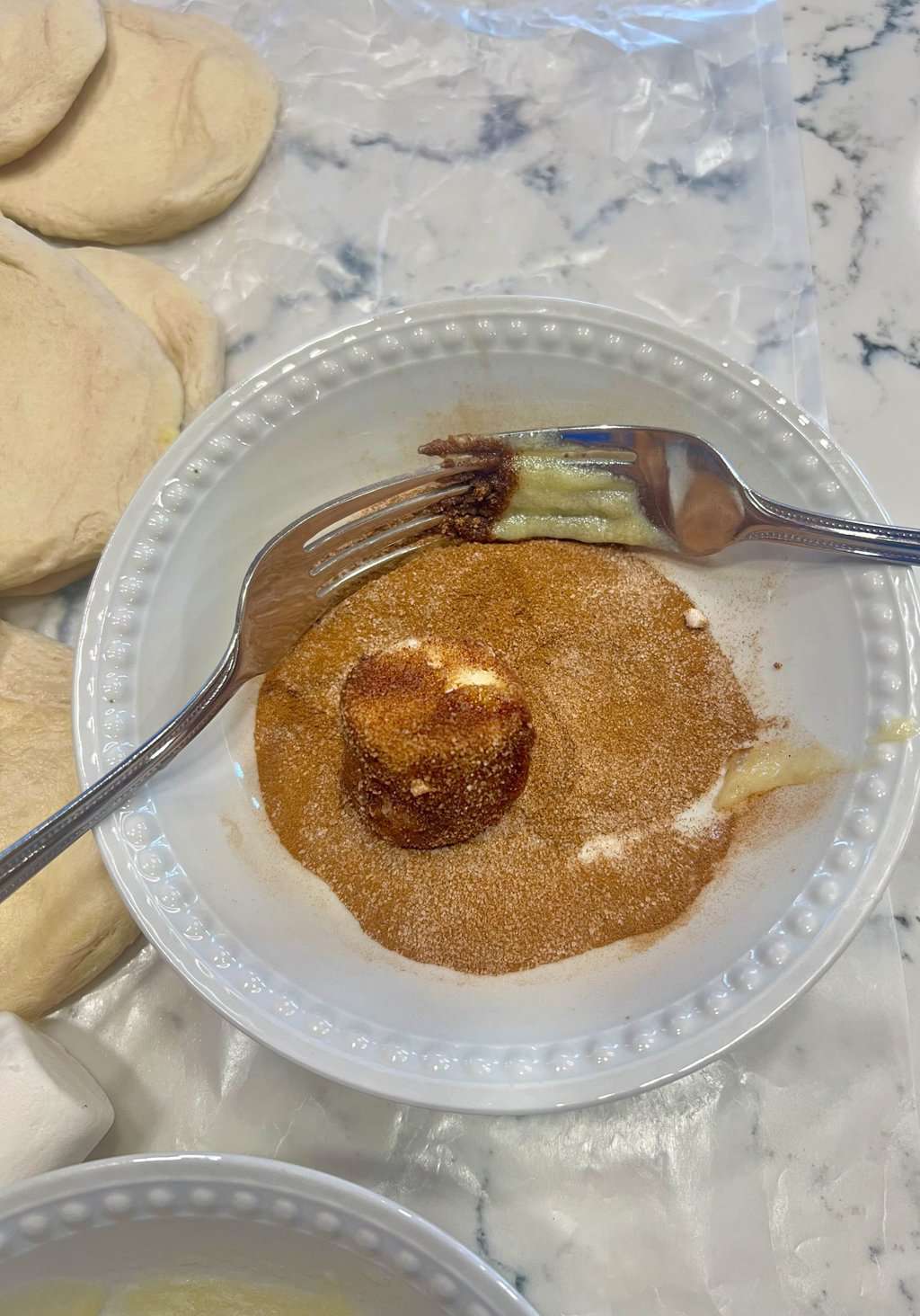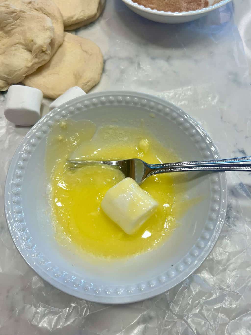 - Dip one marshmallow in melted butter and coat well. Then, roll the marshmallow in the cinnamon sugar mixture until well coated.