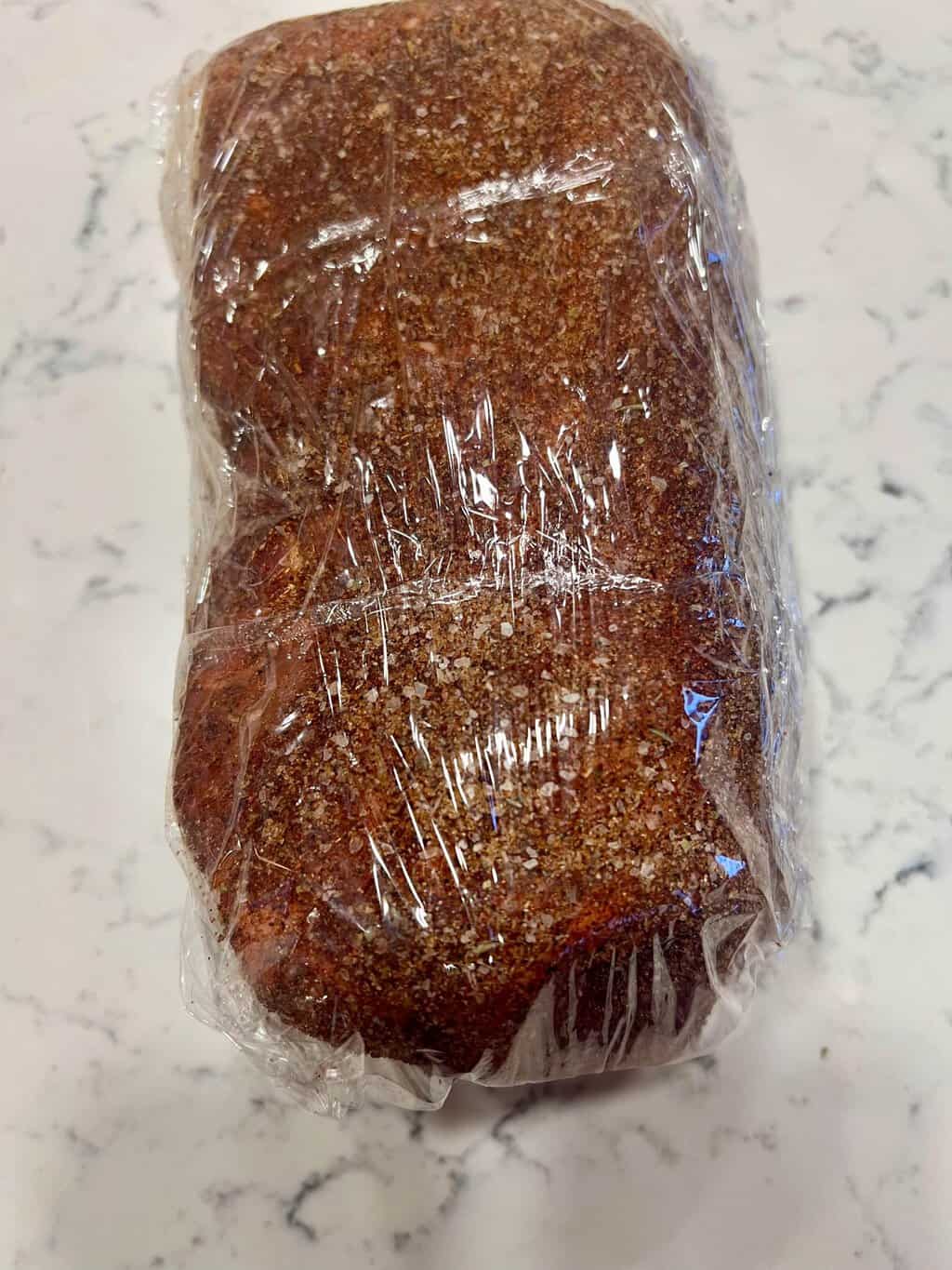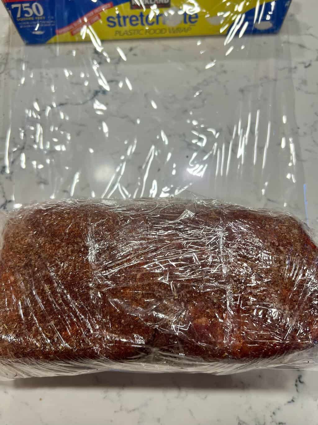 - Place the pork roast vertically and wrap in plastic wrap. Turn the roast horizontally and wrap again. Wrapping it well will keep the liquid in close proximity to the roast as it marinates with the dry rub. Place in refrigerator overnight.