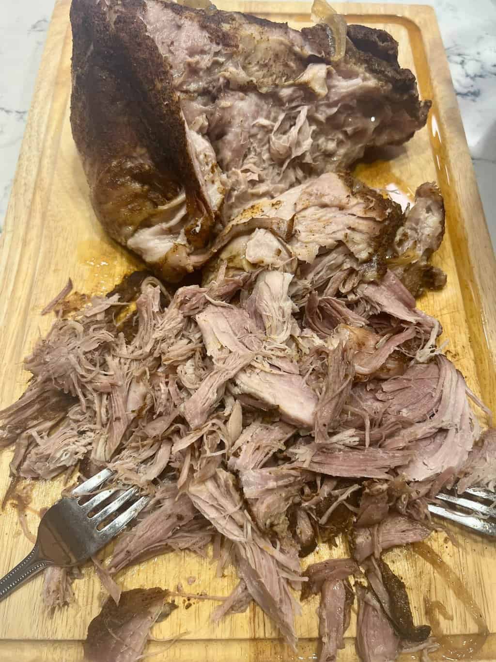 - Shred with two forks. Remove large veins of fat.