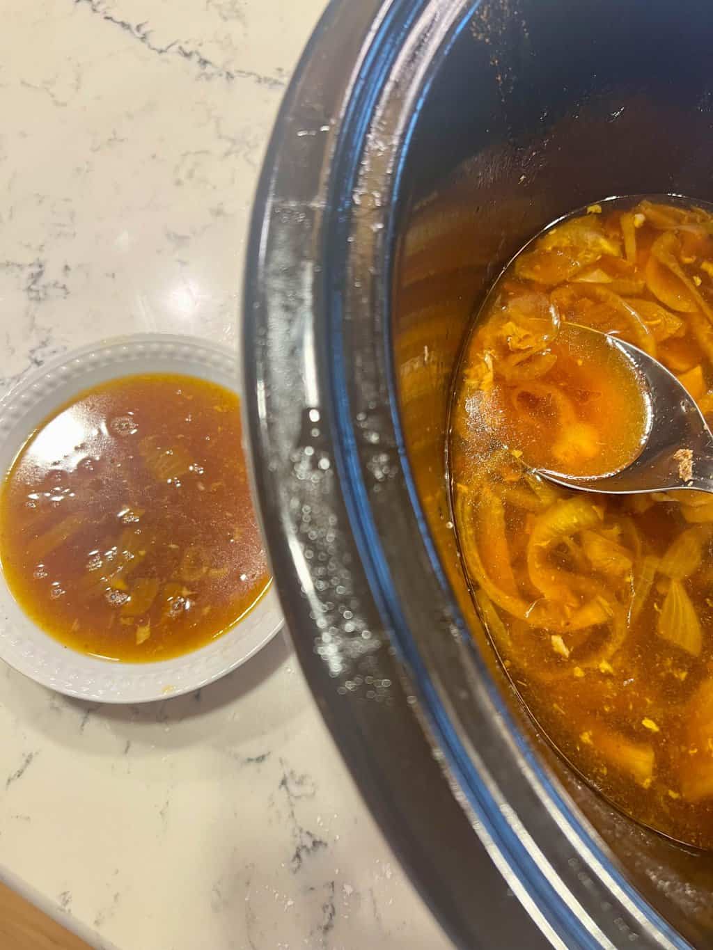 - Remove half the broth from the slow-cooker and set aside.