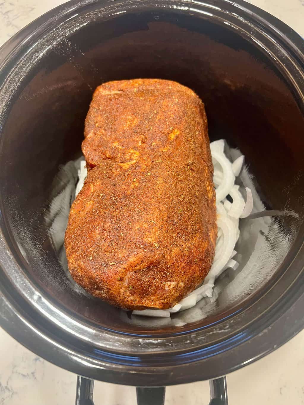 - The next morning, morning, peel and thinly slice an onion. Place it in the bottom for a slow-cooker sprayed with non-stick spray.