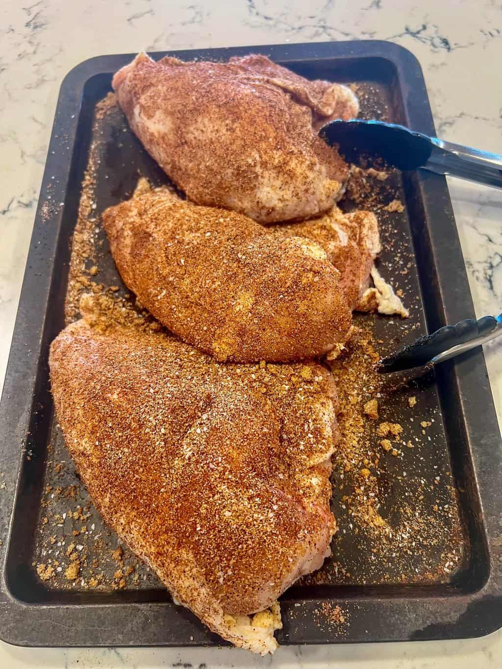 - Season both sides of chicken breast with spice rub. Set aside.