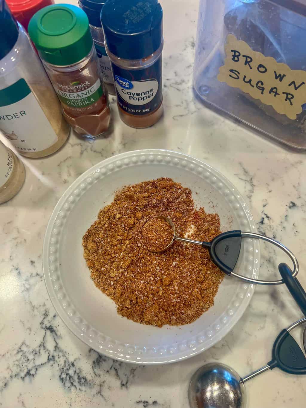 - Add barbecue spice rub ingredients to a bowl and stir well.
