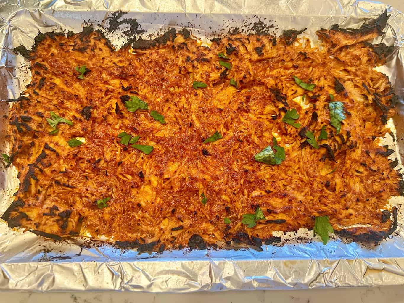 - For an optional step, spread the BBQ chicken on a baking sheet that’s been covered with aluminum foil and sprayed with no stick spray. Broil until bits of the chicken caramelize and brown. The caramelized bits add texture and flavor. I highly recommend this step.