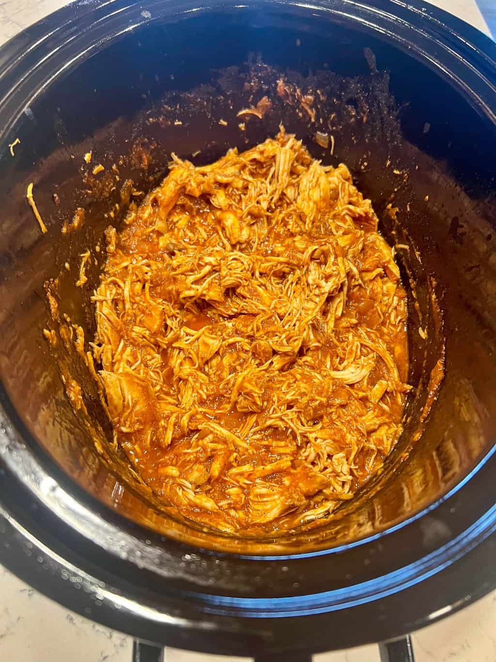 - Remove chicken from slow-cooker. Pull from bones. Discard bones and skin. With two forks, shred chicken and add back to BBQ sauce in slow-cooker. Stir to coat.