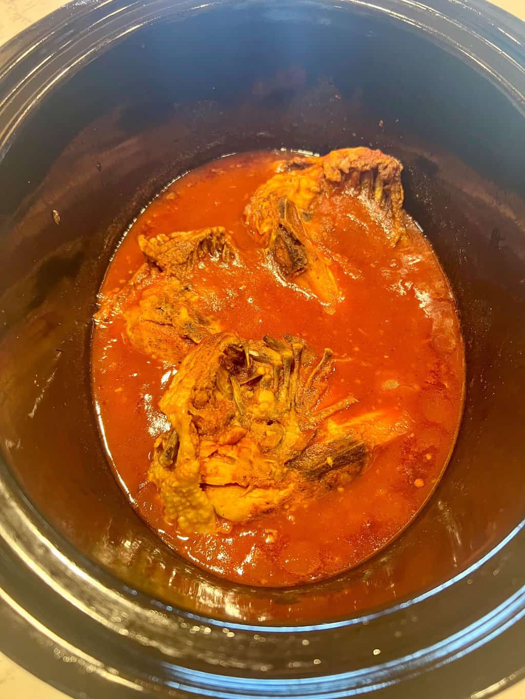 - At the end of four hours, remove the chicken, discard the bones and skin. Shred the chicken with two forks and place it back in the sauce. Stir well.