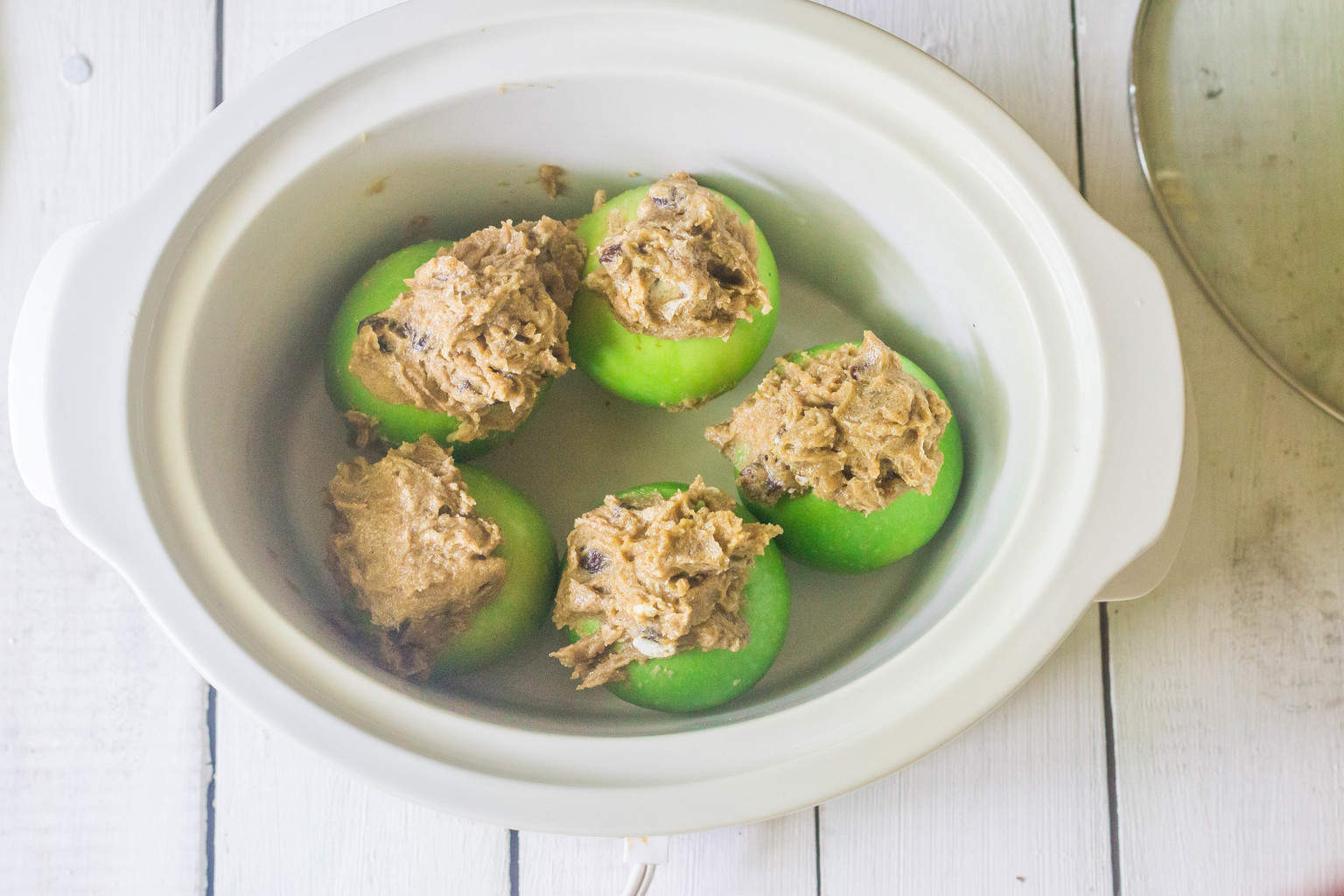 Baking apples cored and stuffed with butter, brown sugar, cinnamon and raisins. Baked in a slow-cooker. My updated version of baked apples I learned to cook in Girl Scouts.