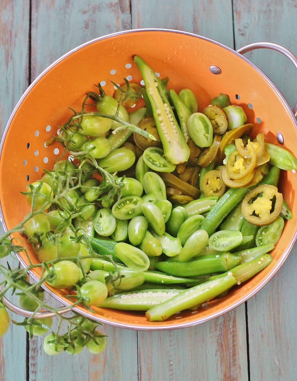 We have a bumper crop of cherry tomatoes so I used them green instead of a big tomatoes. Substitute your favorite variety of green tomatoes if you don’t have a cherry variety.