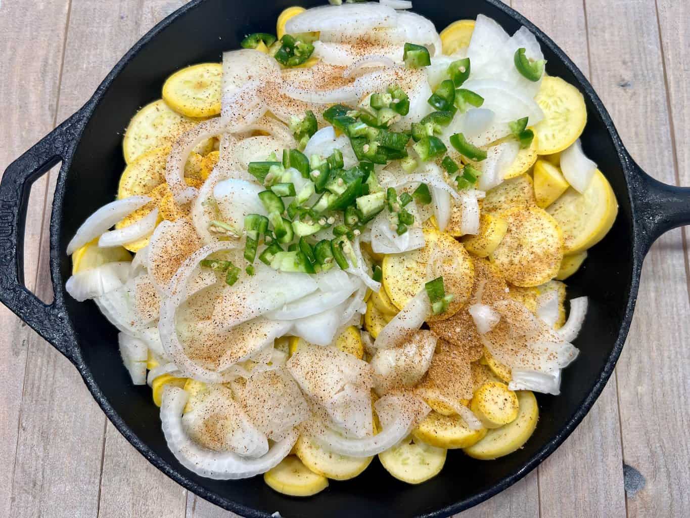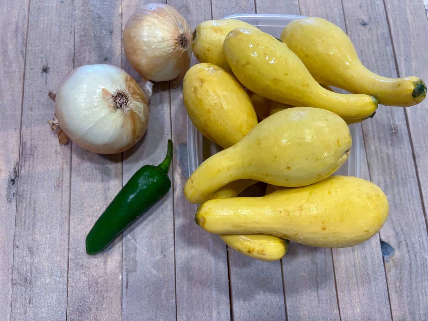 - Gather squash, sweet onions, and jalapeno pepper.