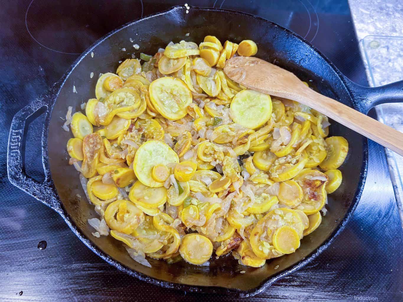 Stewed Summer Squash and Sweet Onions is an easy side dish cooked in a cast iron skillet with butter and bacon grease until slightly caramelized.