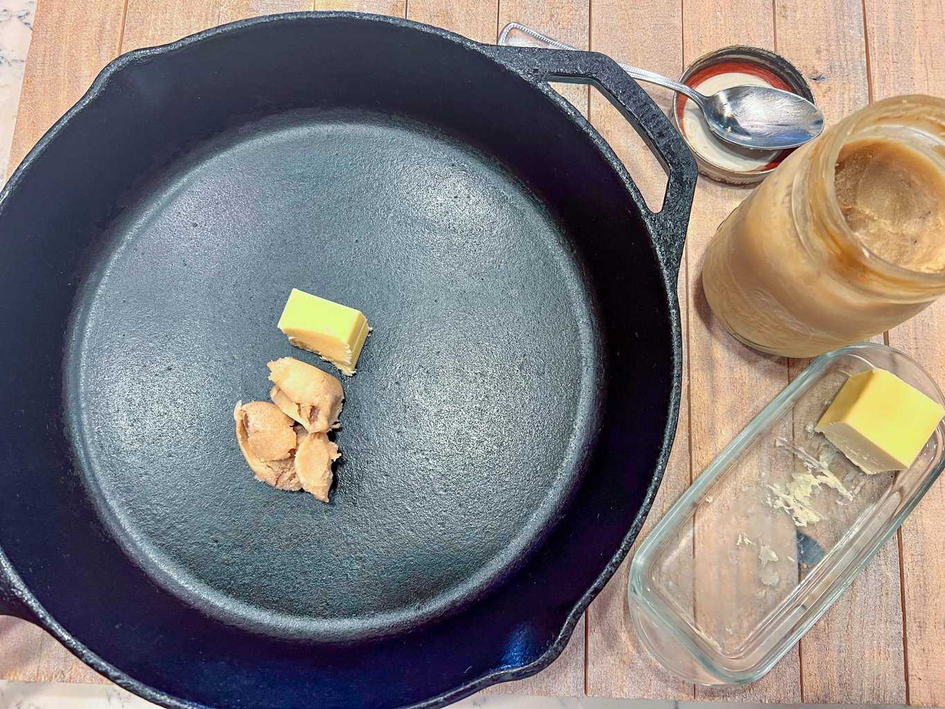 - Add bacon grease and butter to a large cast iron skillet. There's no need to heat the skillet prior.